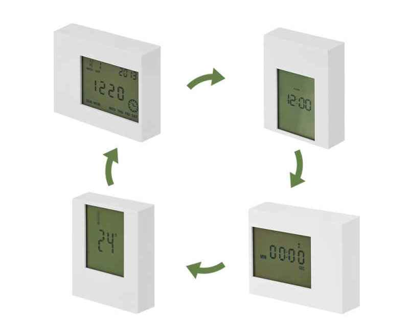 Многофункциональные настольные часы с подсветкой, которые в зависимости от положения показывают разные значения: дата и время, будильник, таймер и температура воздуха.