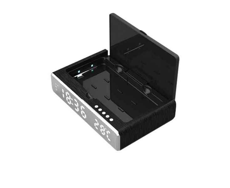 Отличное современное приобретение – это электронные цифровые часы Boxxuv со сдержанным дизайном, наличием емкости для стерилизации телефона, часов, ключей и прочих карманных мелочей. Дополнительно имеет функцию отображения времени и температуры на экране, и самая необходимая функция – это порт беспроводной зарядки по технологии Qi, все вместе – high tech подарок для любого события! Функции: Время / Температура / Будильник / Стерилизация / Беспроводная зарядка Qi