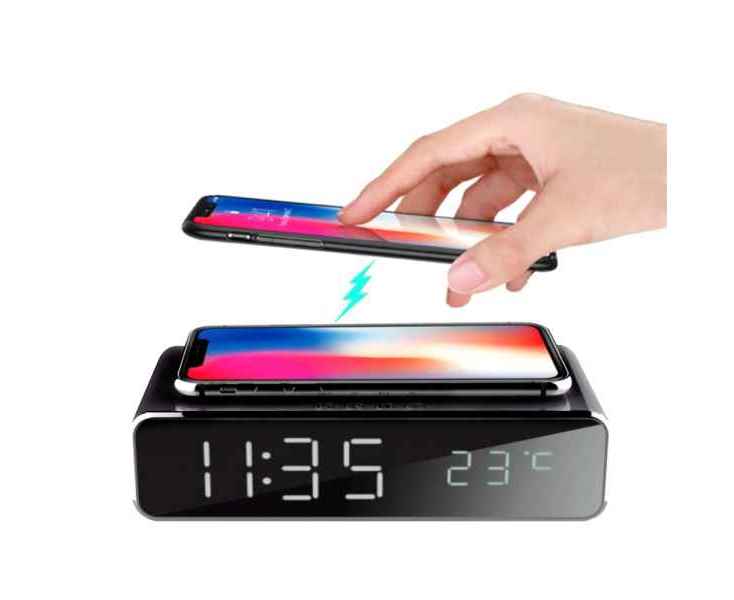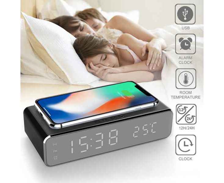 Часы имеют простой и элегантный дизайн с LED дисплеем, на котором отображается комнатная температура. Устройство позволяет устанавливать три разных времени будильника для вашего удобства. Наверху часов расположен модуль для беспроводной зарядки с мощностью 5 Вт, что позволяет быстро и удобно заряжать ваш смартфон. Размеры упаковки часов составляют 17.4 x 10.4 x 5 см.