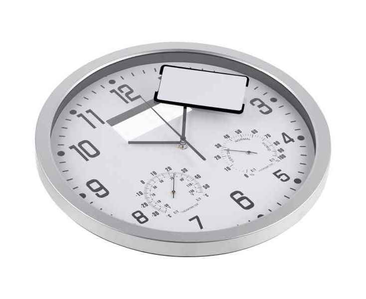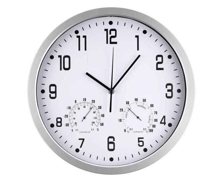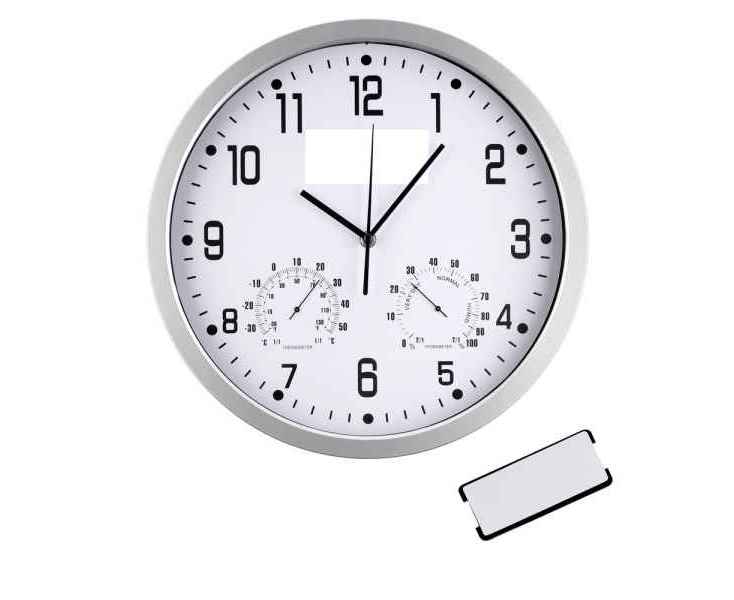 Классические настенные часы с термометром и гигрометром. В верхней части циферблата находится планка для нанесения логотипа, которая легко извлекается с тыльной стороны корпуса.