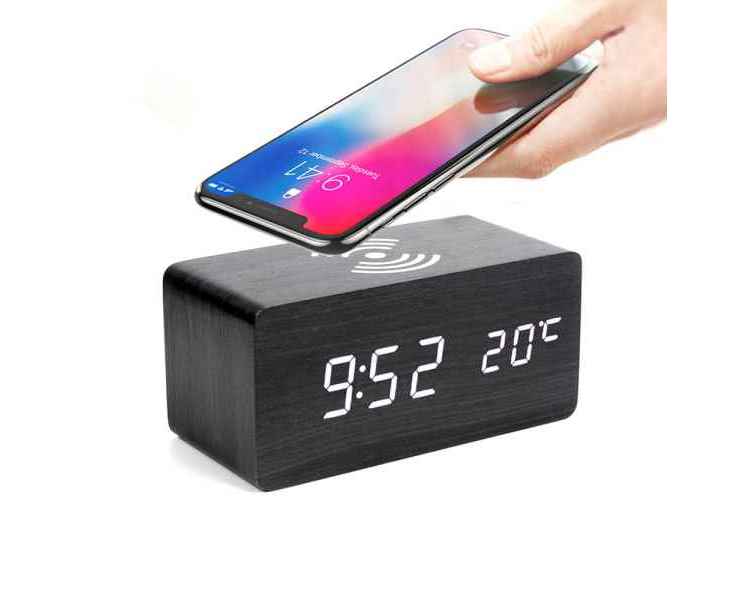 Многофункциональные деревянные часы с белой подсветкой и функцией беспроводной зарядки. Функции: часы, дата, температура, 3 режима будильника, функция управления звуком (когда данная функция активирована, дисплей гаснет через 15 секунд; вы можете активировать дисплей, хлопнув в ладоши, или слегка постучав по часам). В промежуток времени 18.00-7.00 яркость подстветски снижается на 50%. Мощность беспроводной зарядки 5W. Источник питания: от сети, либо с использованием 4х батареек 1,5В-ААА (не входят в комплект). Поставляются вместе с русскоязычной инструкцией и USB кабелем для подключения к сети