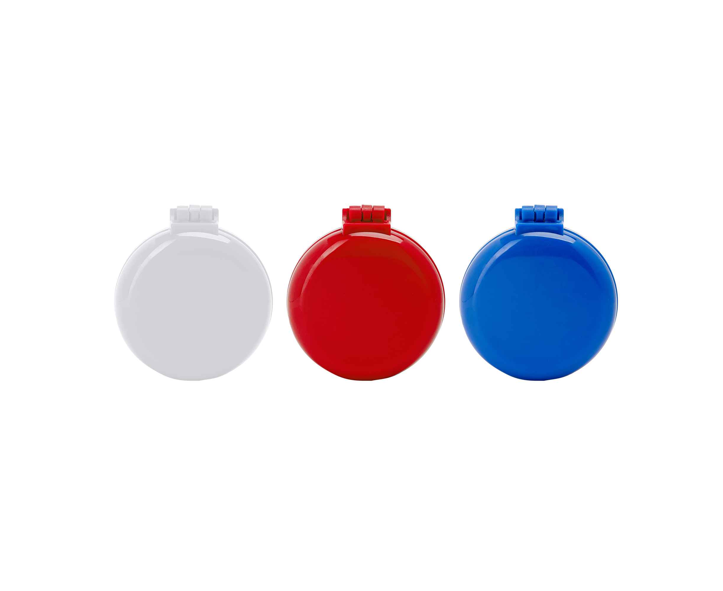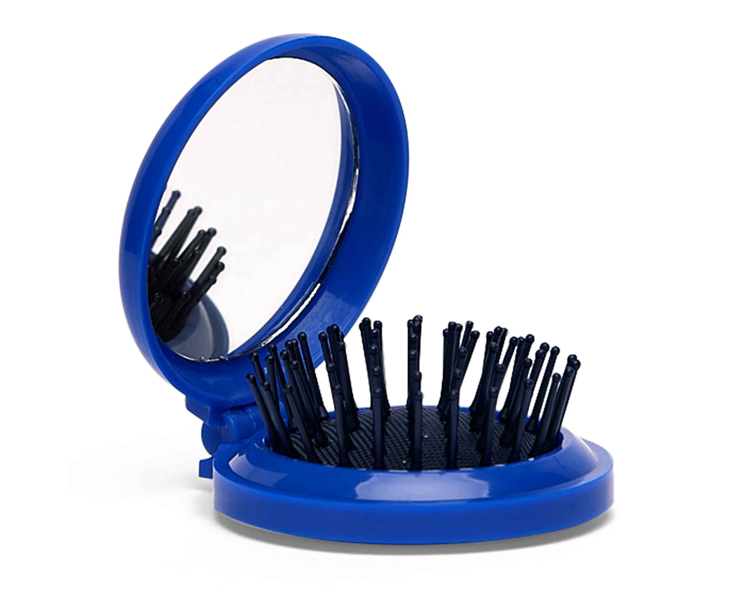 Практичная складная кисть с круглым зеркальцем. В открытом виде состоит из зеркала в одной части и кисточки в другой.
