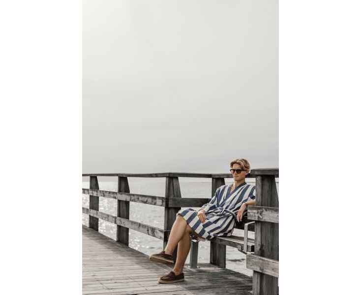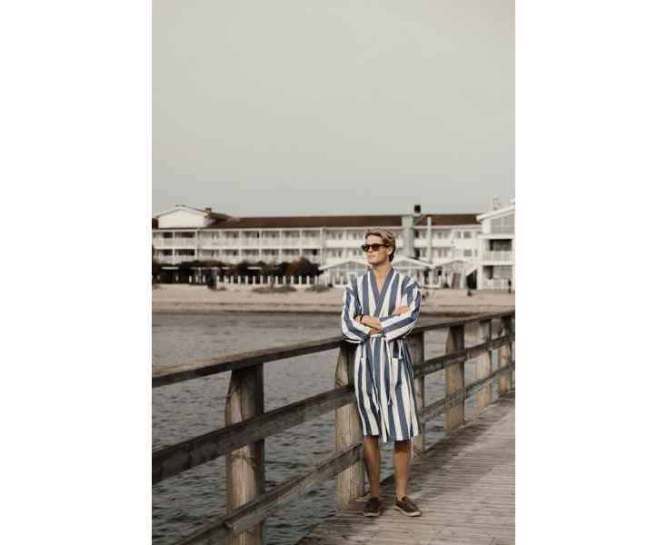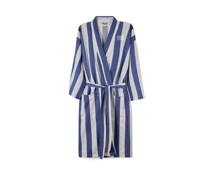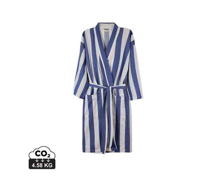Стильный халат VINGA Ornos просто создан для пляжа и отдыха. Легкий и воздушный материал объединил в себе мягкость хлопка и простоту полиэстера — благодаря нему полотенце быстро сохнет. Изделие выполнено в классическом стиле с двухцветными полосками. Для максимального удобства предусмотрены карманы, рукава 3/4 и пояс на талии. Сертификация GRS (Global Recycled Standard) гарантирует, что вся цепочка поставок переработанных материалов проверена и подтверждена. Содержание вторсырья от общего веса изделия: 69% переработанный хлопок и 29% переработанный полиэстер. Плотность ткани: 200 г/м².
