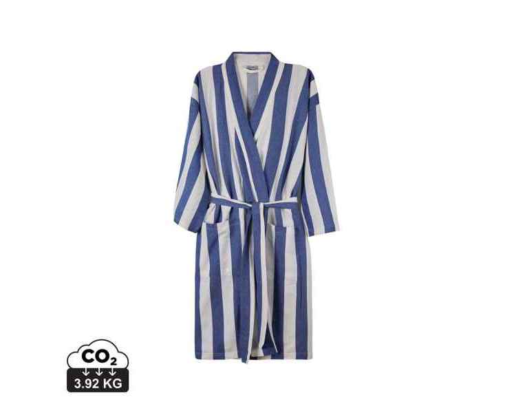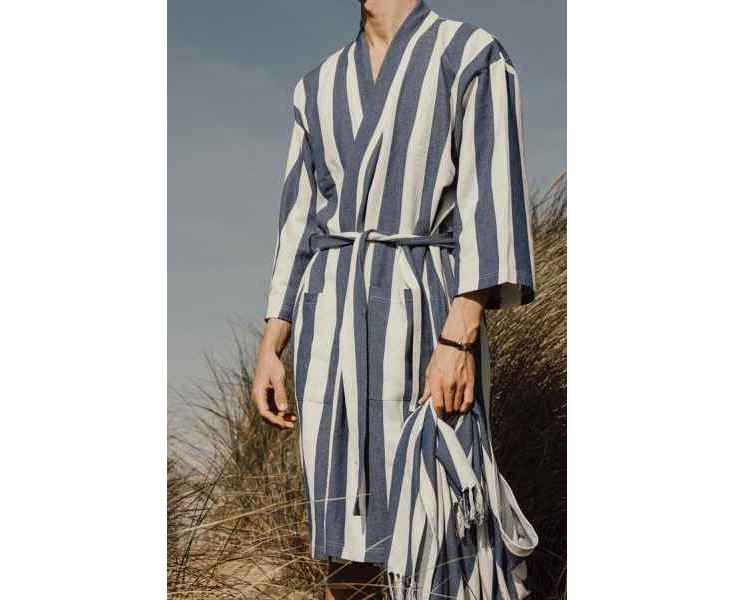 Стильный халат VINGA Ornos просто создан для пляжа и отдыха. Легкий и воздушный материал объединил в себе мягкость хлопка и простоту полиэстера — благодаря нему полотенце быстро сохнет. Изделие выполнено в классическом стиле с двухцветными полосками. Для максимального удобства предусмотрены карманы, рукава 3/4 и пояс на талии. Сертификация GRS (Global Recycled Standard) гарантирует, что вся цепочка поставок переработанных материалов проверена и подтверждена. Содержание вторсырья от общего веса изделия: 69% переработанный хлопок и 29% переработанный полиэстер. Плотность ткани: 200 г/м².