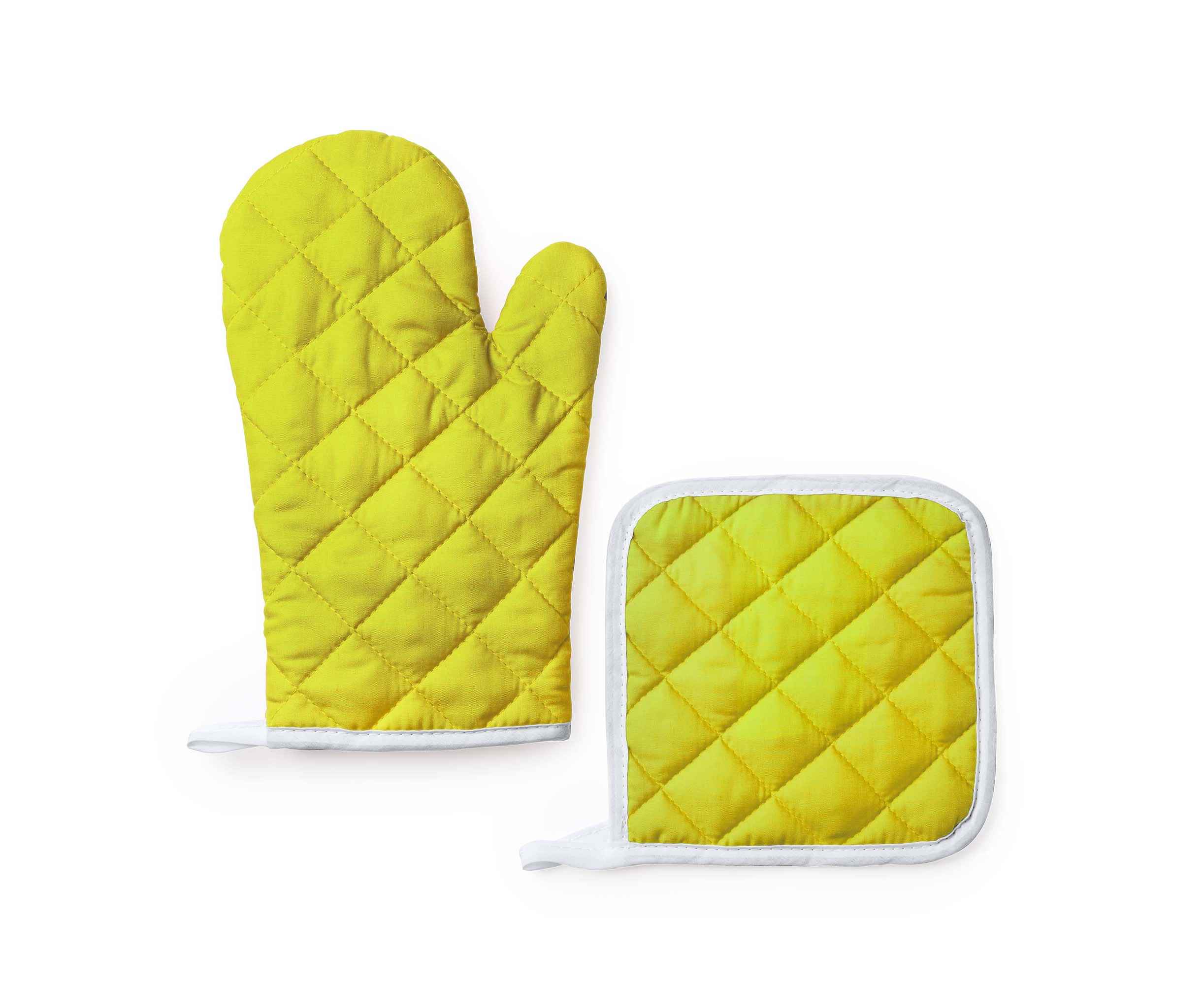 Кухонные рукавицы из 100% переработанного хлопка, с плоской стороной, идеально подходящей для маркировки, и ремнем для подвешивания.