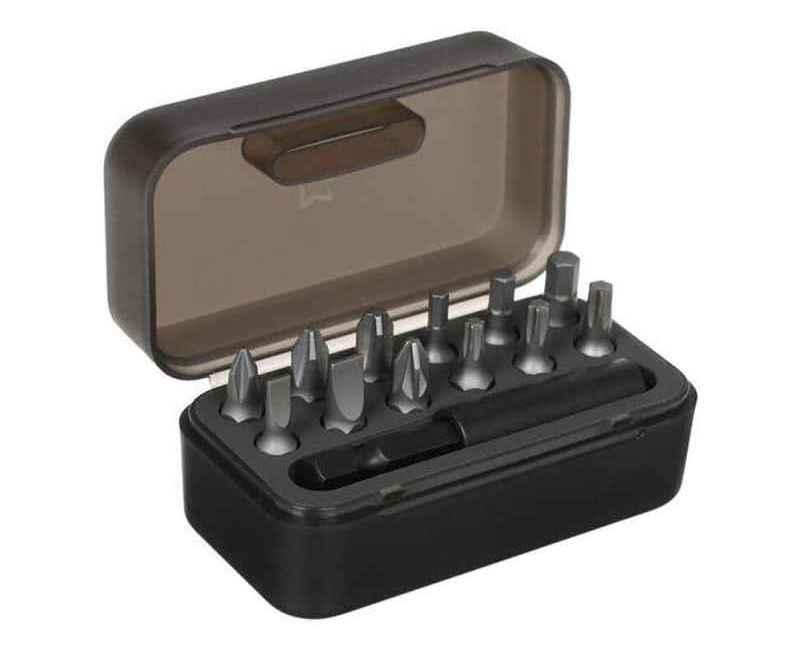 • Биты 12 шт.: (PH1; PH2; PH3; SL4; SL6; H3; H4; H5; T15; T20; T25; PZ2)