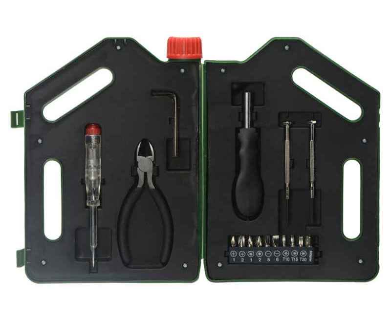 Набор инструментов в футляре в виде канистры включает в себя 1 тестер напряжения, 1 пару плоскогубцев, 1 шестигранный ключ, 1 рукоятку, к которой можно крепить отвертки, 2 прецизионные отвертки, 1 крестообразную головку, 1 плоскую головку, 10 бит.