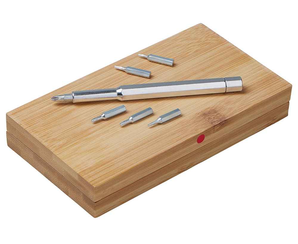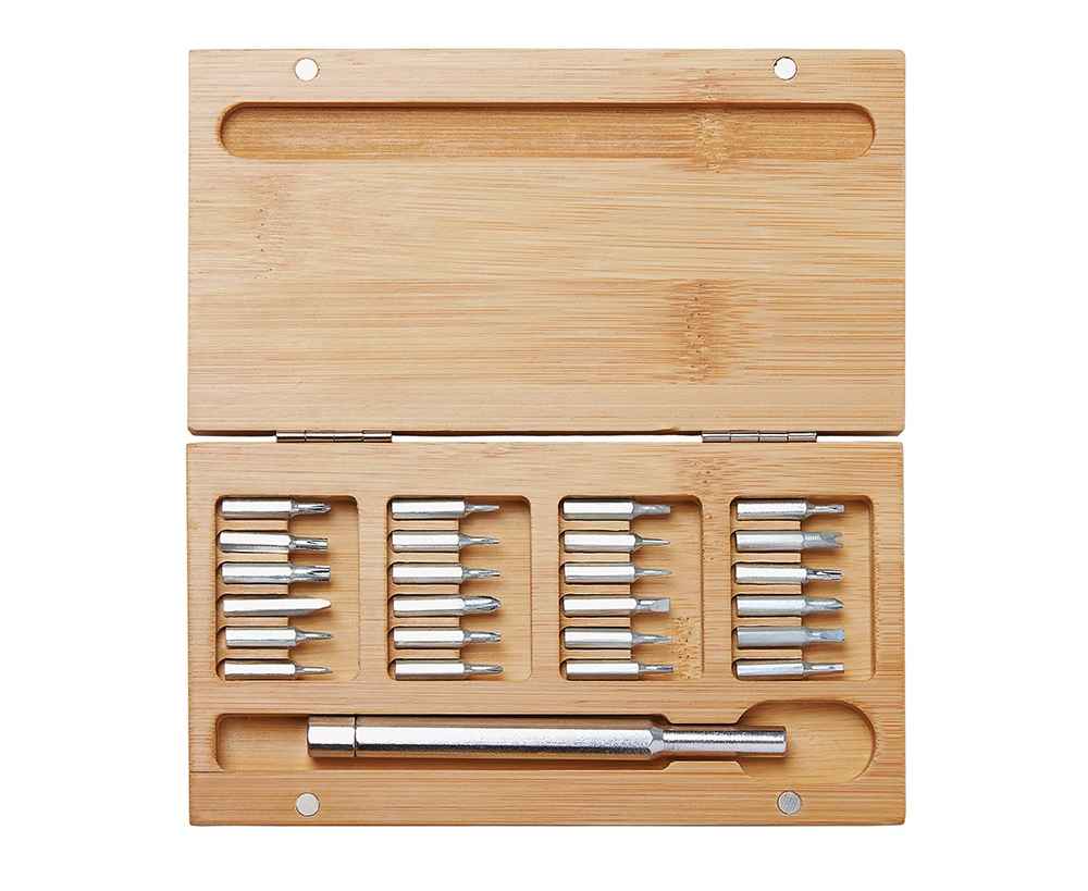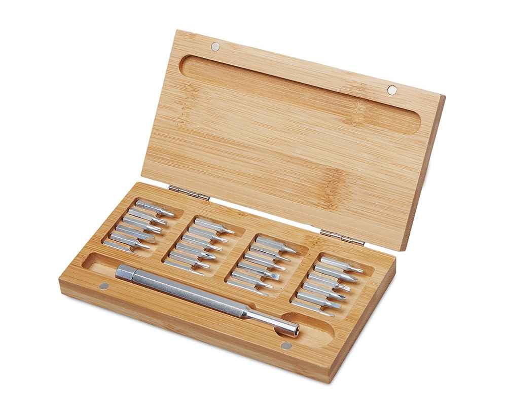 Стильный и практичный набор отверток в элегантном корпусе из натурального бамбука. Компактный кейс закрывается на магниты, а верхняя крышка отмечена круглым красным стикером для удобной идентификации. Внутри — отвертка и 24 наиболее востребованные биты: крестовые, плоские и звездочки, которые подойдут для решения большинства бытовых и профессиональных задач. Набор выполнен из экологичных материалов — прочной стали и натурального бамбука. Классическая прямоугольная форма без выступающих деталей делает его особенно удобным для персонализации и нанесения логотипа.