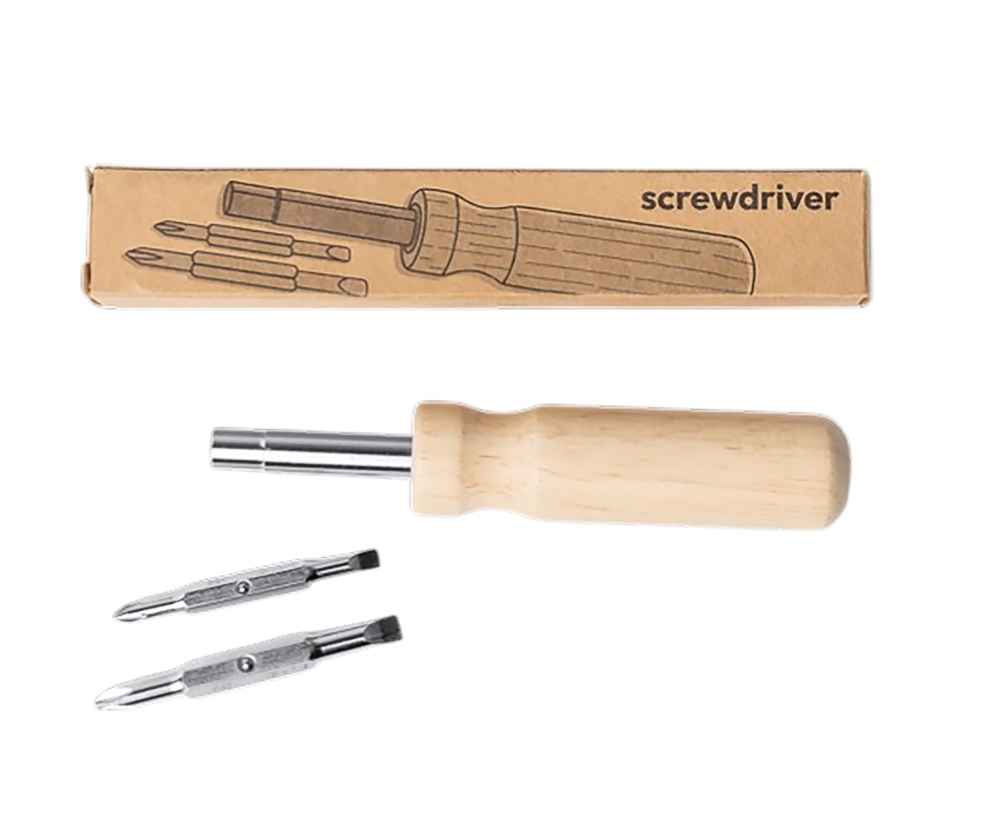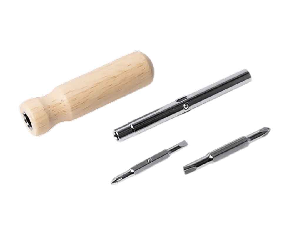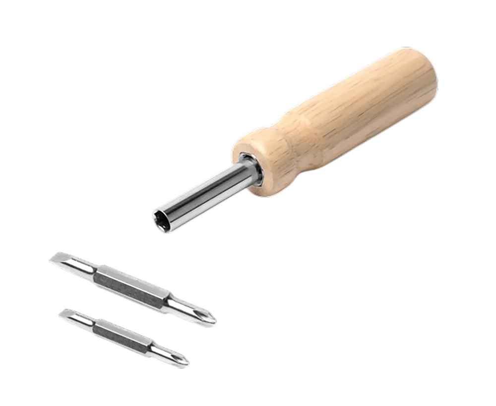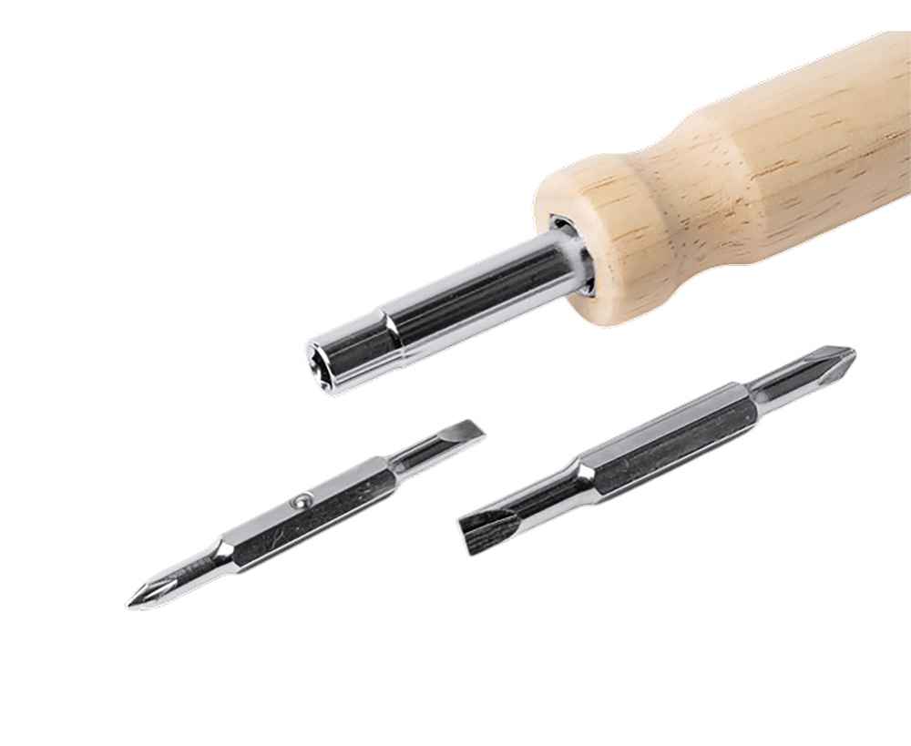 Отвертка из нержавеющей стали с круглой деревянной ручкой. В комплекте две биты с 2 насадками под крестовую и плоскую отвертки.