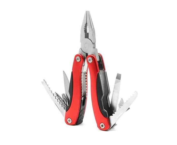 - Функции: Плоскогубцы, Кусачки, Консервный нож, Открывалка для бутылок, Средняя и маленькая плоские отвертки, Крестовая отвертка, Гладкое лезвие, Зубчатое лезвие, Пила, Напильник
