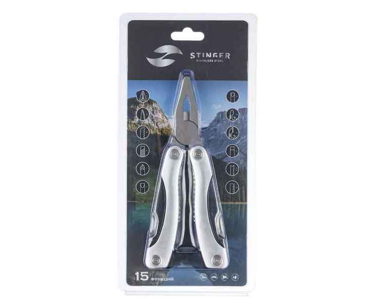 Подробнее о Stinger Мультитул Stinger, 100x50 мм,15 функций, сталь/алюминий/пластик, серебристый, в нейлоновом чехле