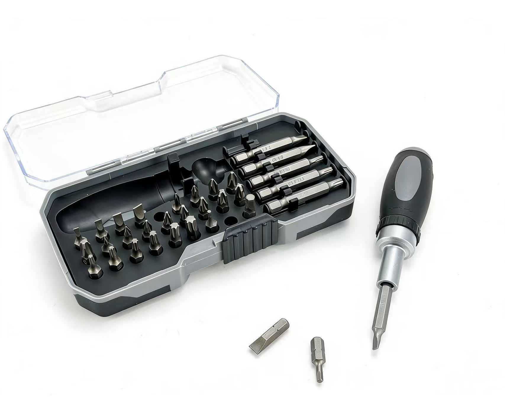 • 27 стандартных бит (25 мм): Плоские (SL3-6), Крестовые (PH0-3, PZ0-3), Шестигранники (H3-6), Звездочки (T10-40), Квадрат (S0-3).