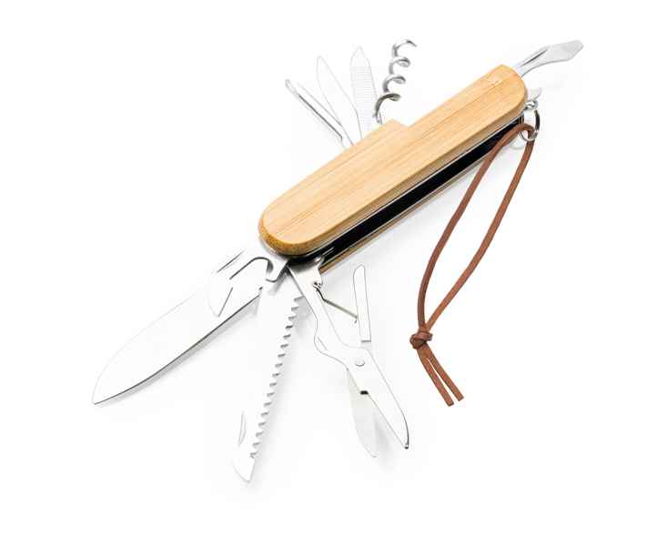 Многофункциональный нож с аксессуарами из нержавеющей стали и основной конструкцией из бамбука. 9 функций. Ремень для переноски из искусственной кожи в комплекте.
