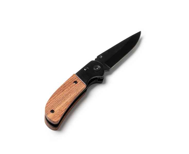 Нож из нержавеющей стали с черным лезвием и рукояткой из натуральной древесины. Идеальный нож для похода. Нож оснащен системой безопасности.