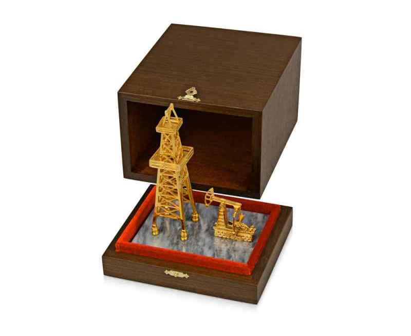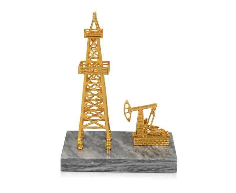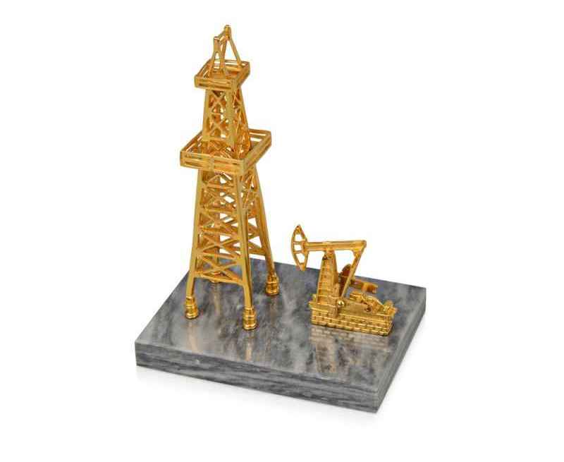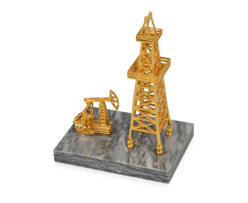 Эксклюзивное изделие Нефтяная вышка. Этот сувенир изготовлен из латуни по традиционной златоустовской технологии художественного литья с применением золочения и никелирования, и установлен на основание из натурального белого мрамора. Нефтяная вышка станет отличным подарком для человека, связанного с делом нефтедобычи, и отлично украсит собою его рабочий кабинет.