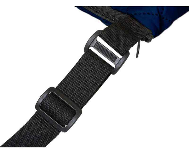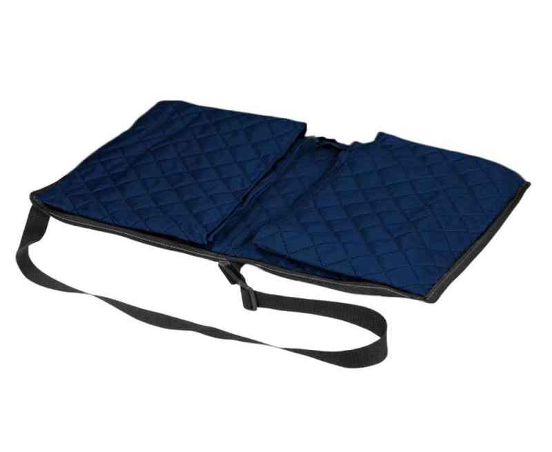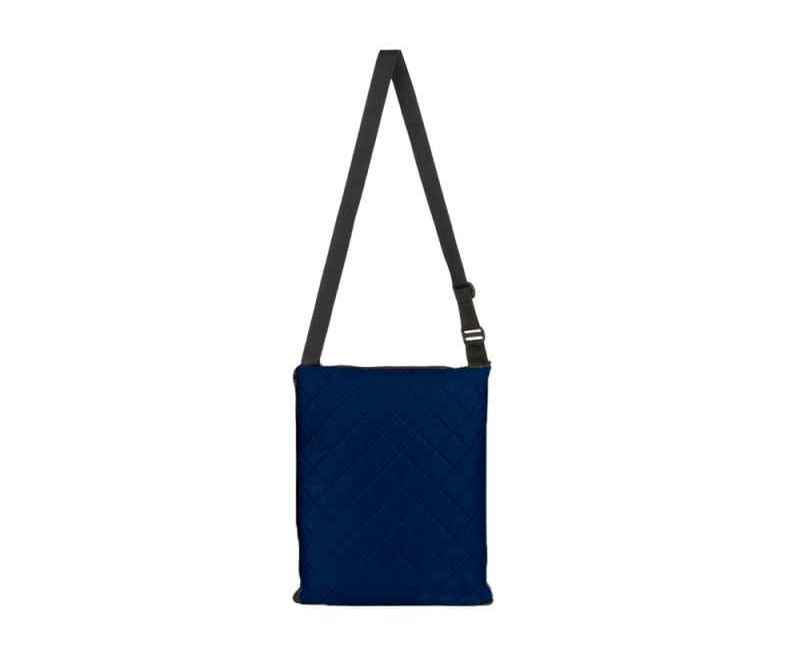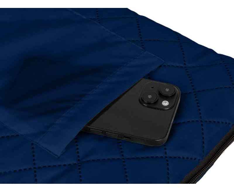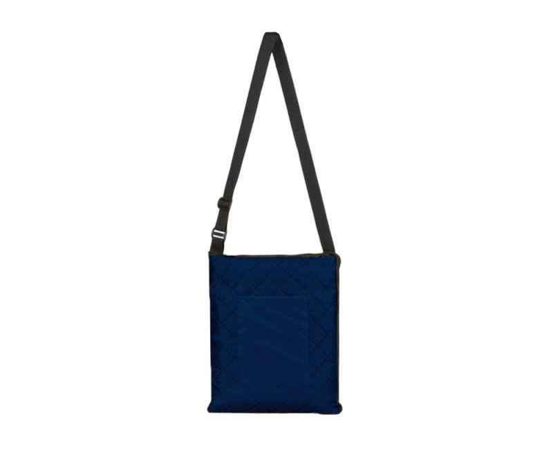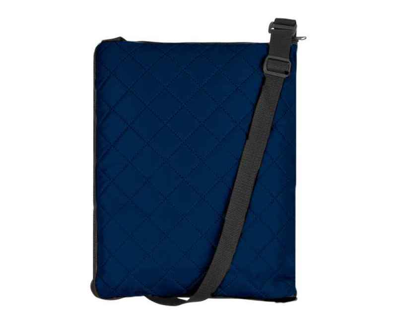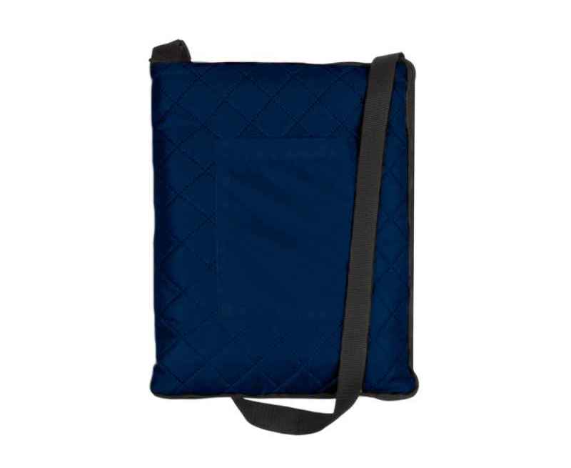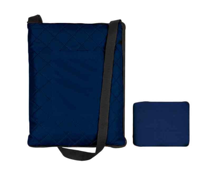 Двухсторонний плед с водоотталкивающим покрытием с одной стороны и мягким флисом с другой. Складывается в сумку на плечо и фиксируется с помощью молнии. В собранном виде имеет регулируемый по длине ремень для переноски и наружный карман для мелочей.