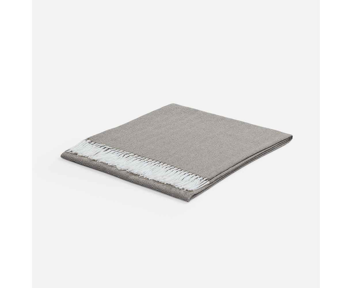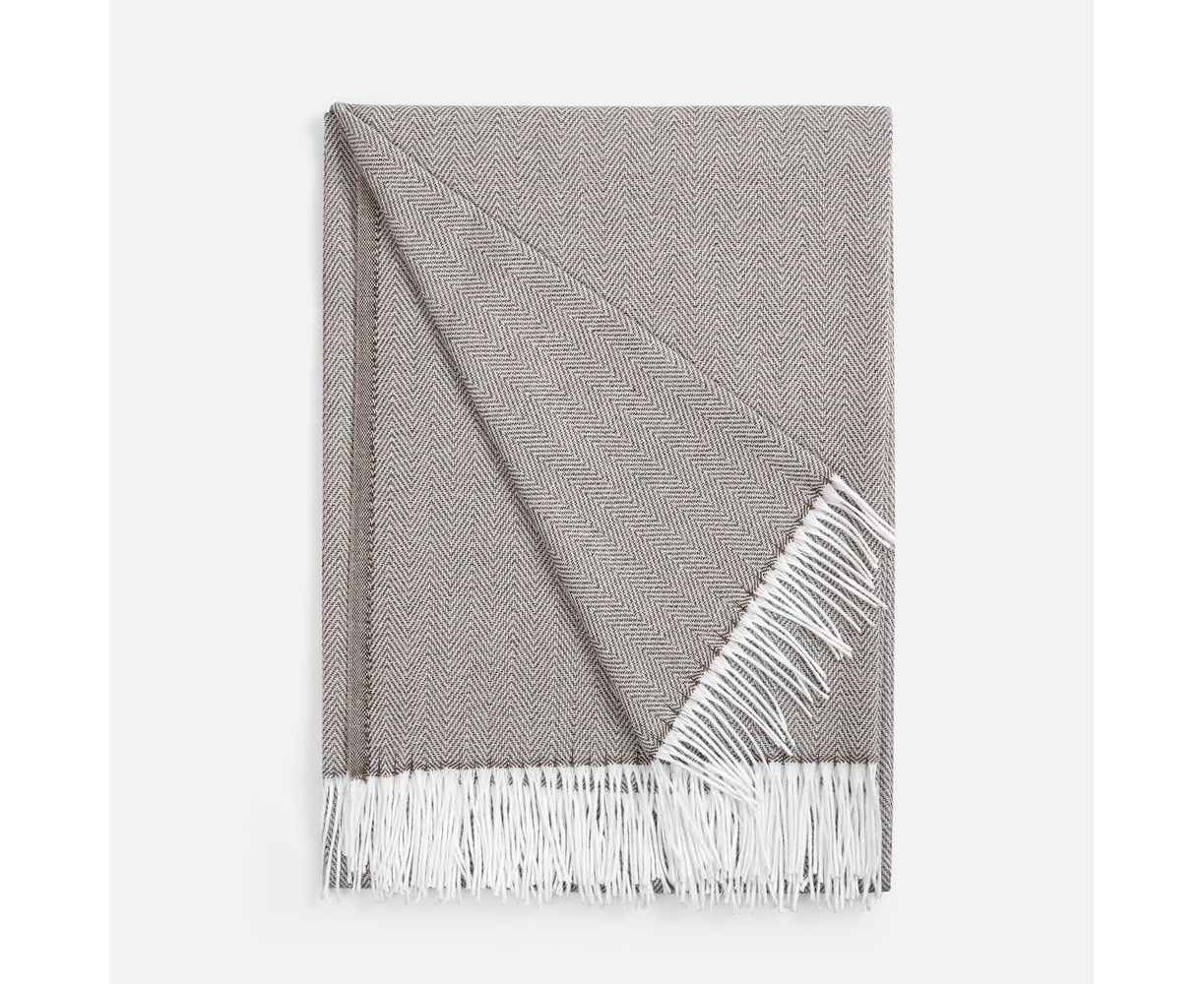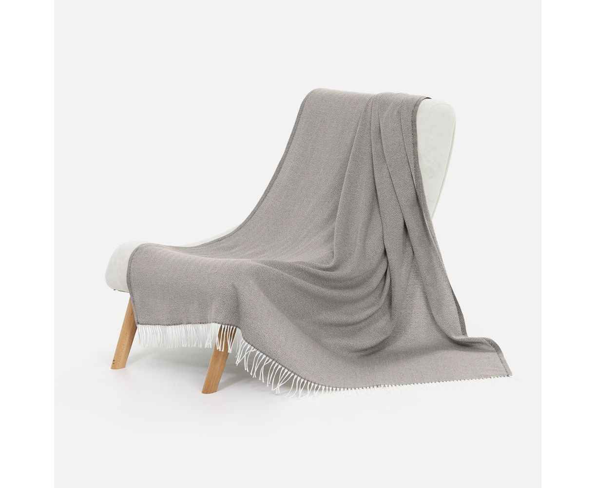 Классический рисунок «елочка» не слишком привлекает внимание, но в то же время добавляет изюминки. Смешанный состав пряжи продлевает срок службы и существенно облегчает уход за пледом.