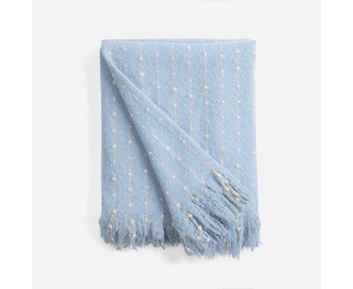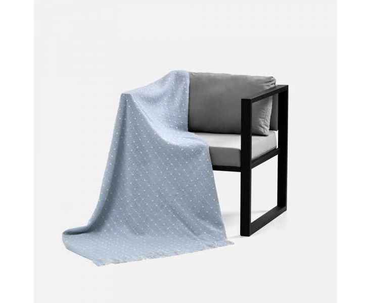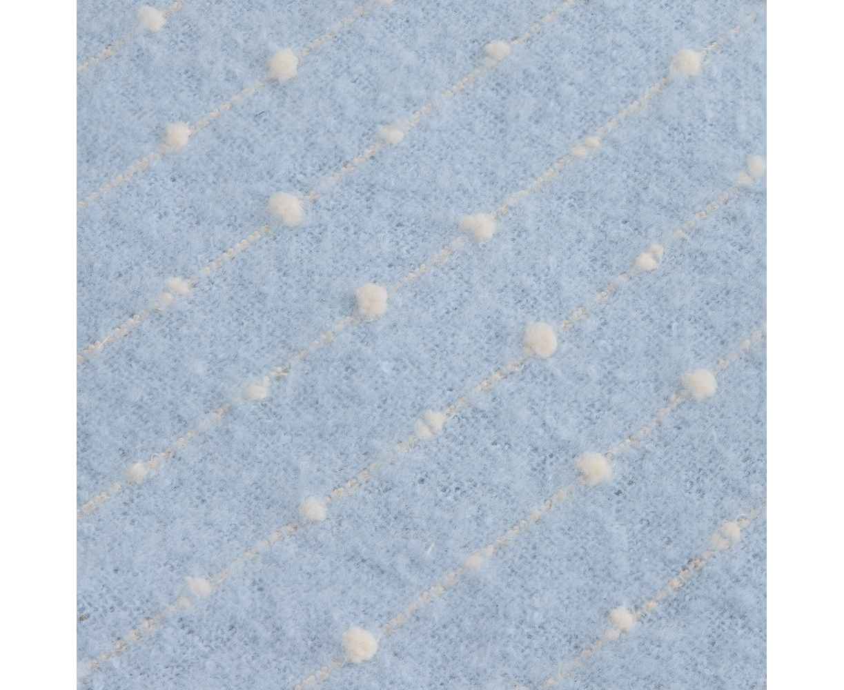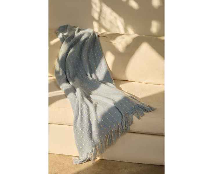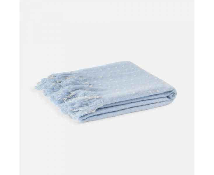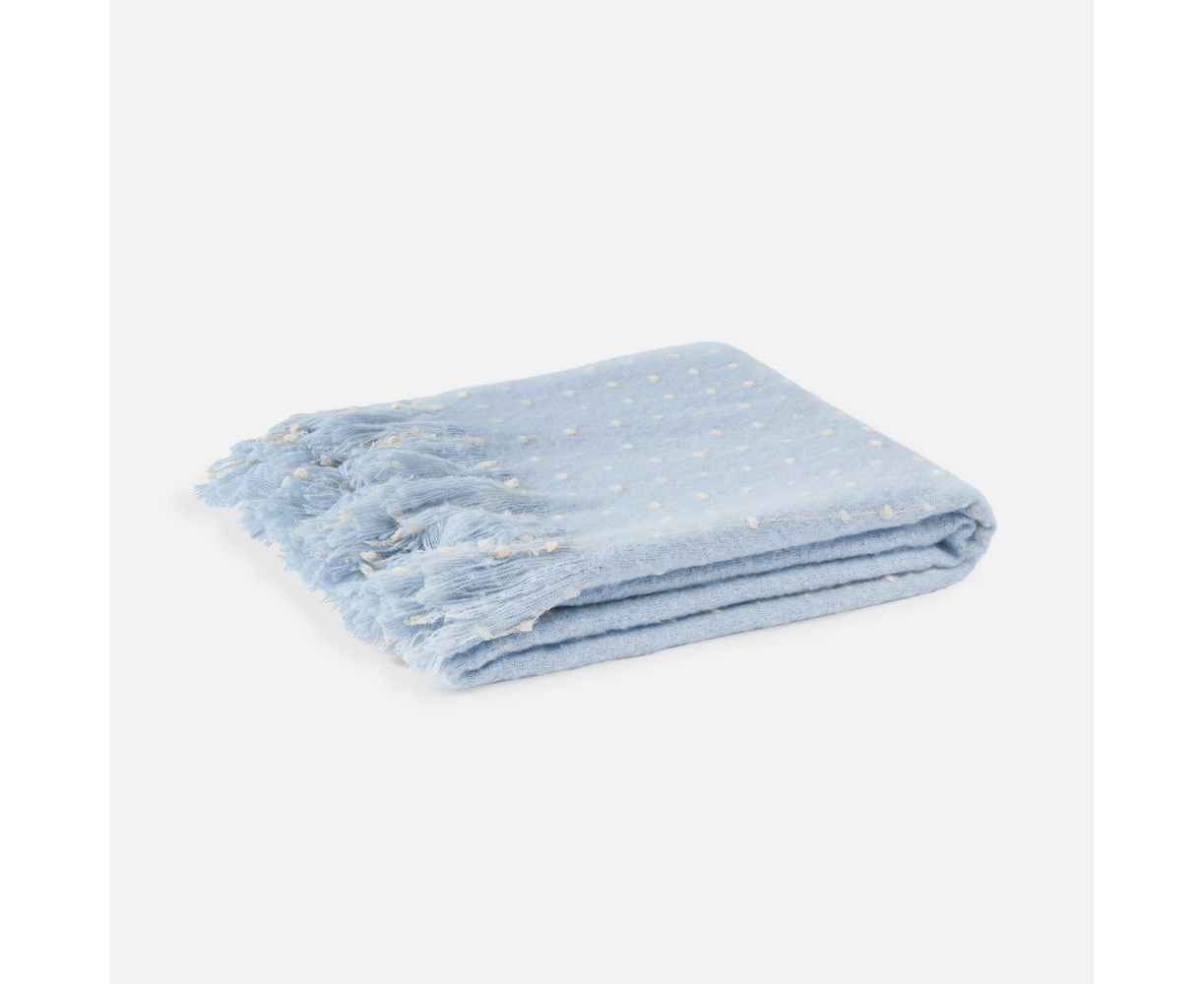 Изысканный плед небесно-голубого оттенка покоряет своим дизайном с первого взгляда. Особая текстура выпуклого узора в точку делает изделие не только визуально привлекательным, но и невероятно приятным на ощупь. Изящный пунктир, плавно переходящий на декоративную бахрому, придает пледу неповторимый шарм и элегантность.