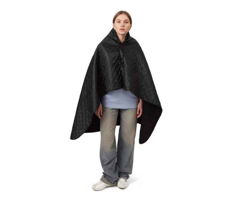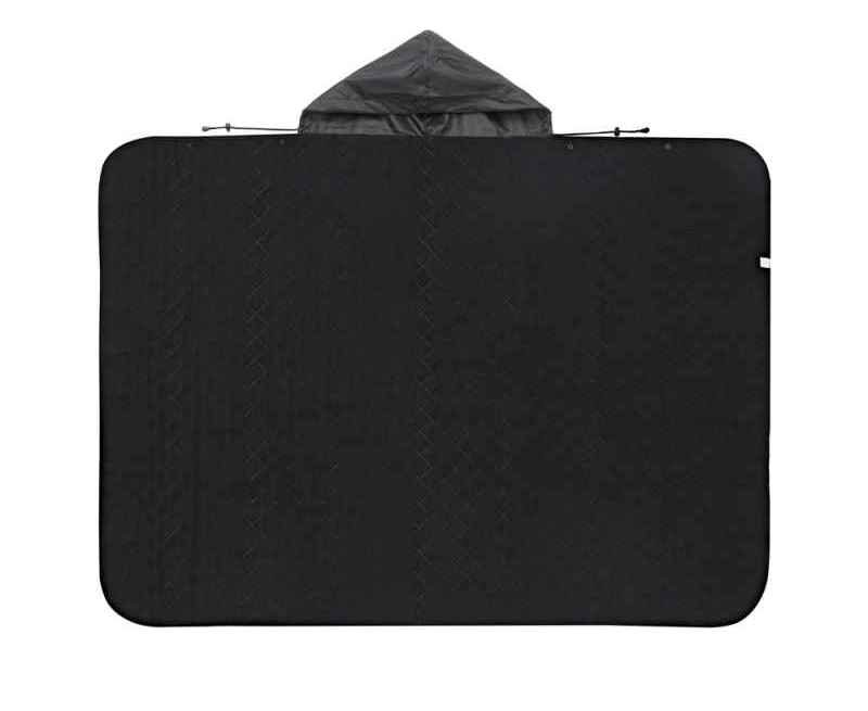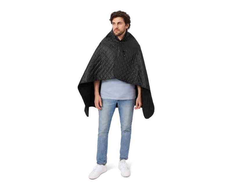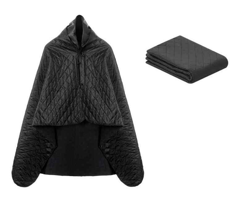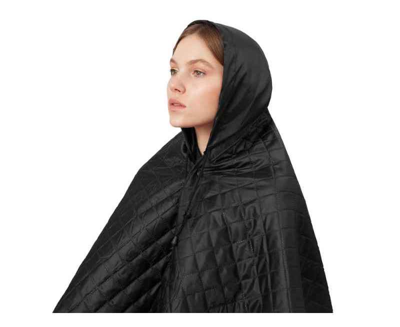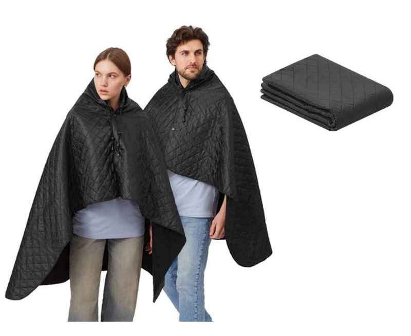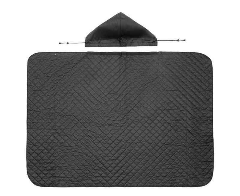 На внутренней стороне из флиса приятно и тепло сидеть, а наружная сторона из полиэстера с водоотталкивающим покрытием не позволяет пледу намокнуть или сильно испачкаться. Для больше удобства использования пледа во время дождя в комплекте идет капюшон, который фиксируется с помощью липучки. Накинув плед на плечи, застегните его на кнопки вверху и наденьте капюшон. Вы не промокните во время неожиданного дождя!