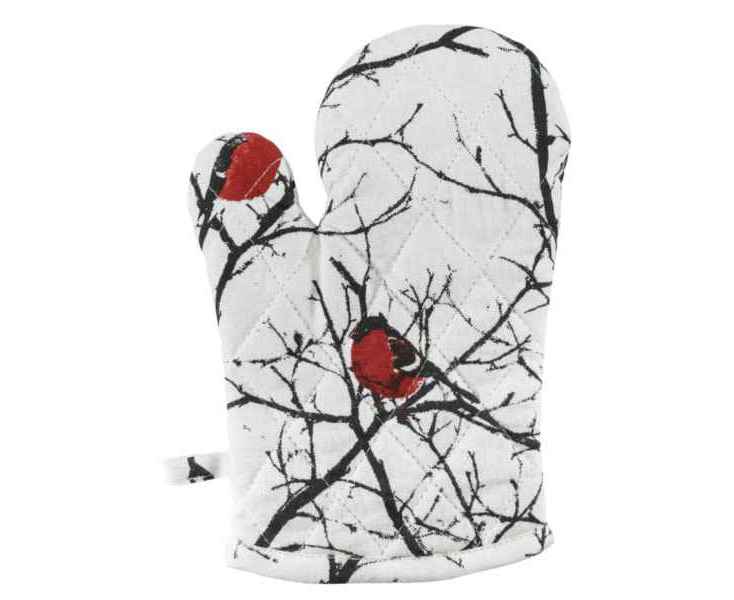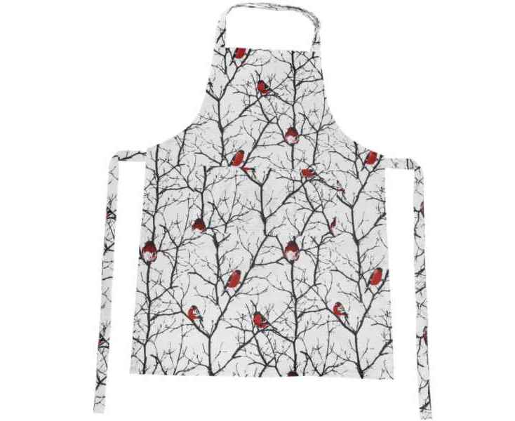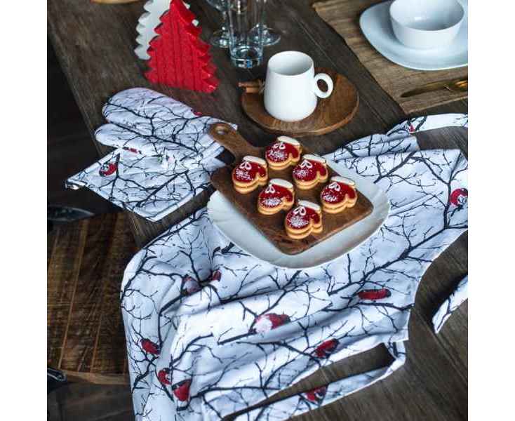 Снегирь – типичный символ русской зимы. Зима надежно замешана даже в название этих птиц –,снегири, снежные птахи. Ярко-красные шарики с толстыми клювами и черными шапочками, усыпавшие ветки и так контрастирующие с ослепительно-снежным зимним лесом, - такой образ снегиря, без сомнения, знаком каждому с детства. Он кочует с одной книжной страницы на другую, перелетает с открытки на открытку, а теперь он и на всех предметах подарочного набора: на,переднике и двух прихватках., Передник защитит вашу одежду во время активного приготовления новогодних блюд, а прихватки надежно сберегут ваши руки от ожогов. Состав набора: 1),Передник 2)Прихватка-рукавица 3)Прихватка прямоугольная
