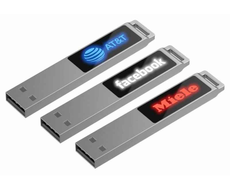 Флешка в тонком металлическом корпусе с пластиковой самоклеящейся шильдой в комплекте. Благодаря встроенной в корпус светодиодной матрице, логотип, выполненный на шильде методом лазерной гравировки, подсвечивается белым, красным, зеленым или синим в зависимости от выбранной модели.
