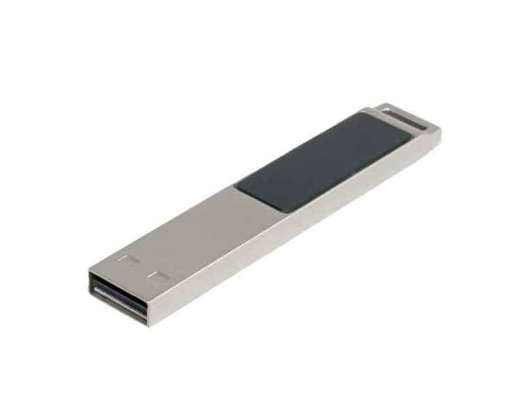 Металлическая флешка с пластиковым шильдом. В зависимости от модели флешки, логотип, выполненный методом лазерной гравировки на шильде подсвечивается синим или белым цветом.