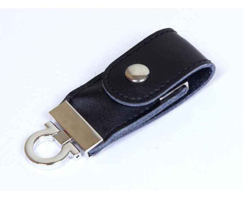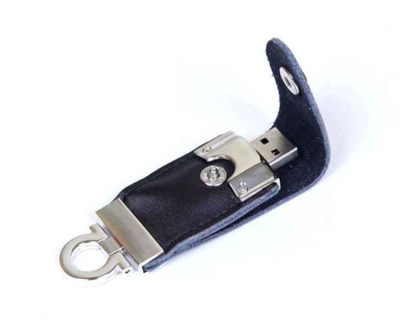 Флеш-накопитель из натуральной кожи с металлическими вставками, в виде брелока для ключей, объем памяти 8 Гб. Кожаный корпус.