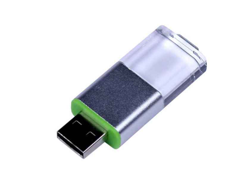 Прозрачная флешка в прямоугольном пластиковом корпусе с металлическими вставками, выдвижной механизм., объем памяти 32 Гб. Пластиковый корпус.