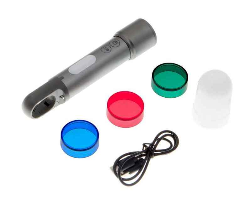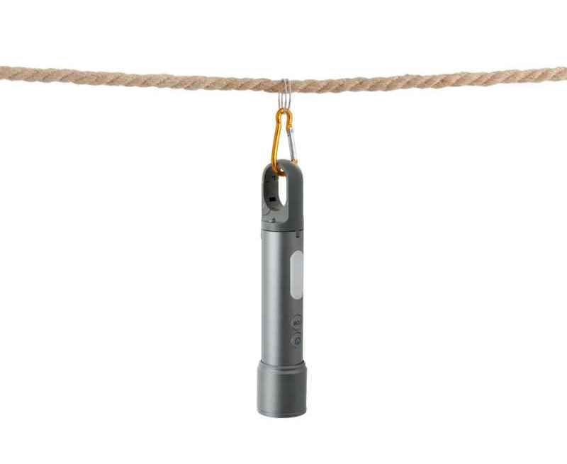 Для удобства использования предусмотрен прочный встроенный карабин. Фонарь прост в управлении: все функции доступны через две кнопки на корпусе. Комплект поставки включает зарядный кабель USB Type-C, инструкцию и сменные цветные насадки. Белая рассевающая насадка превращает фонарь в удобный подвесной светильник.