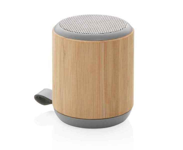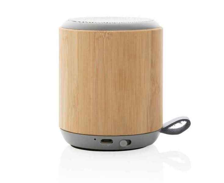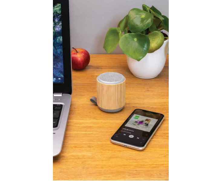 Беспроводная колонка мощностью 3 Вт с литиевым аккумулятором емкостью 300 мАч. Полностью заряженная способна звучать до 3 часов. Благодаря BT 5.0 надежно держит сигнал на расстоянии до 10 м. Изготовлена из натурального бамбука и ткани.