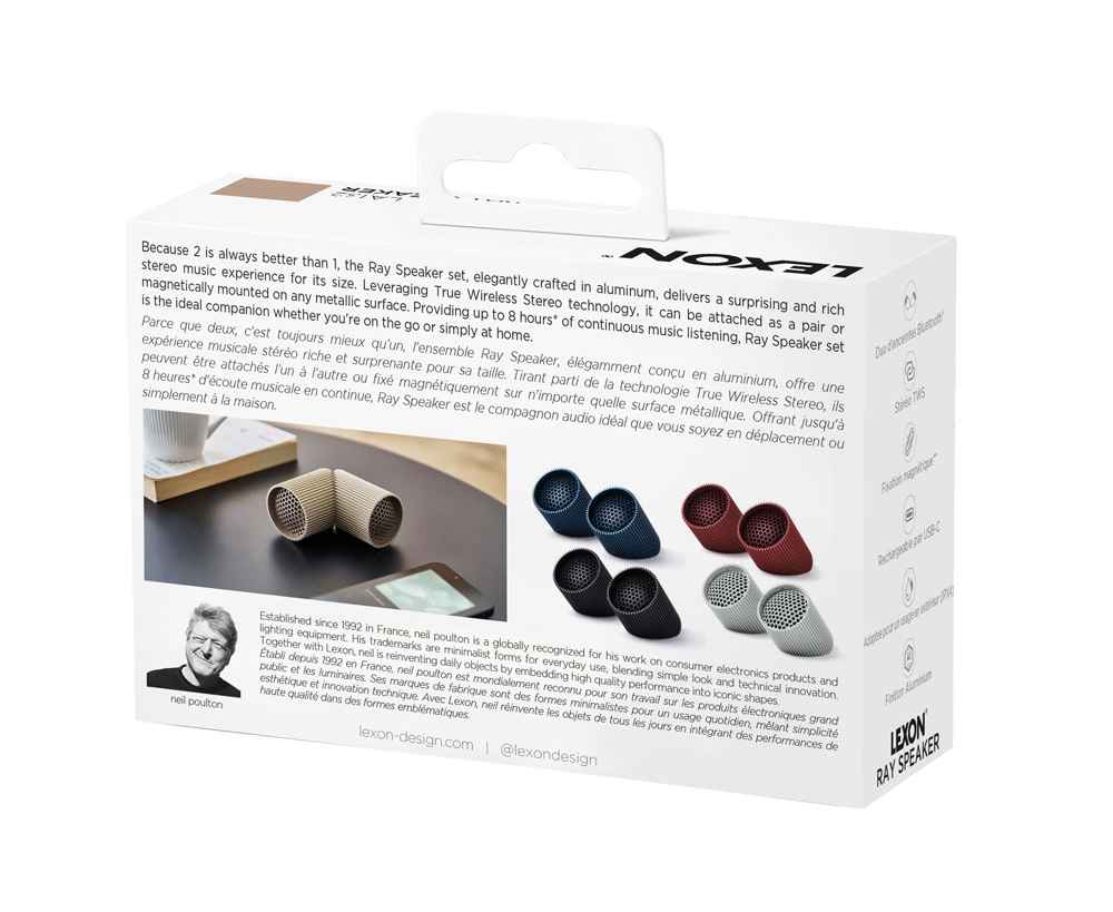 Ray Speaker — это дуэт магнитных Bluetooth®-колонок, удостоенных наград Red Dot Design Award и IF Design Award. Обеспечивая захватывающий стереозвук благодаря технологии True Wireless Stereo, эти колонки легко крепятся друг к другу или к любой магнитной поверхности, что делает их идеальными для использования дома или в дороге. Помимо прослушивания музыки, Ray Speaker позволяет совершать звонки без помощи рук и дистанционно делать селфи. Благодаря аккумулятору, работающему до 8 часов, и элегантному алюминиевому корпусу, они добавят современный штрих в ваш интерьер, а степень водонепроницаемости IPX4 позволяет использовать их на улице. Доступны различные цвета, которые дополнят ваш стиль.