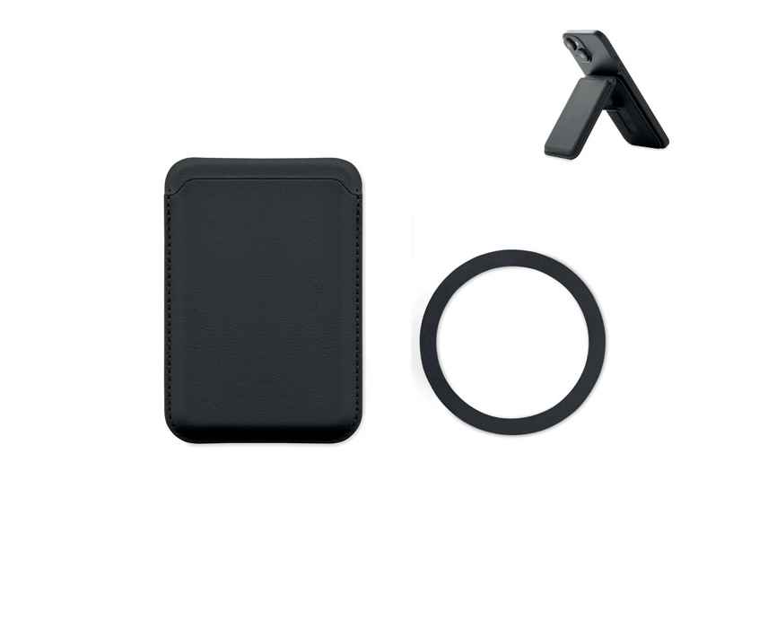 Магнитный держатель для кредитных карт из искусственной кожи (на 3 карты) с функцией подставки. В комплекте дополнительное металлическое кольцо.