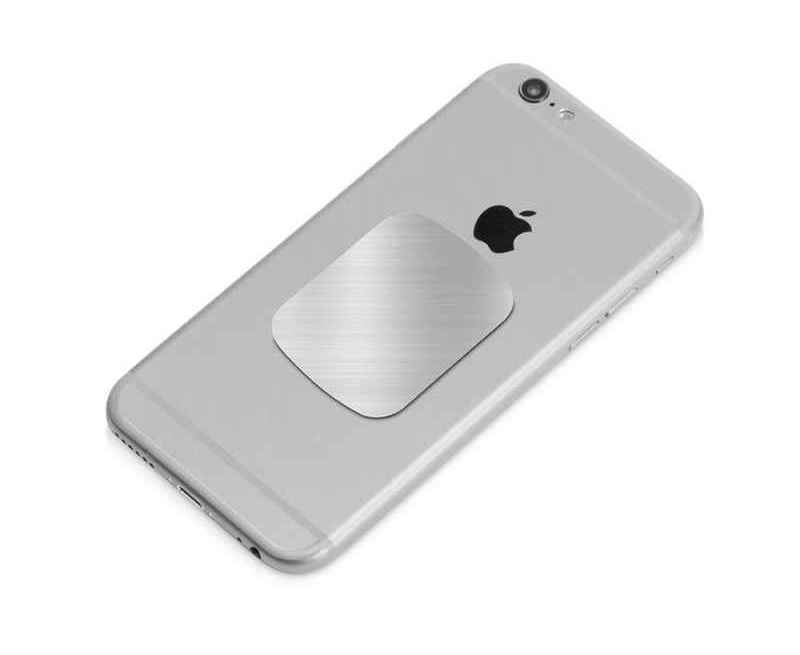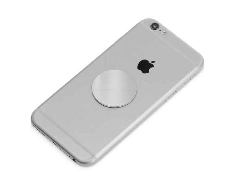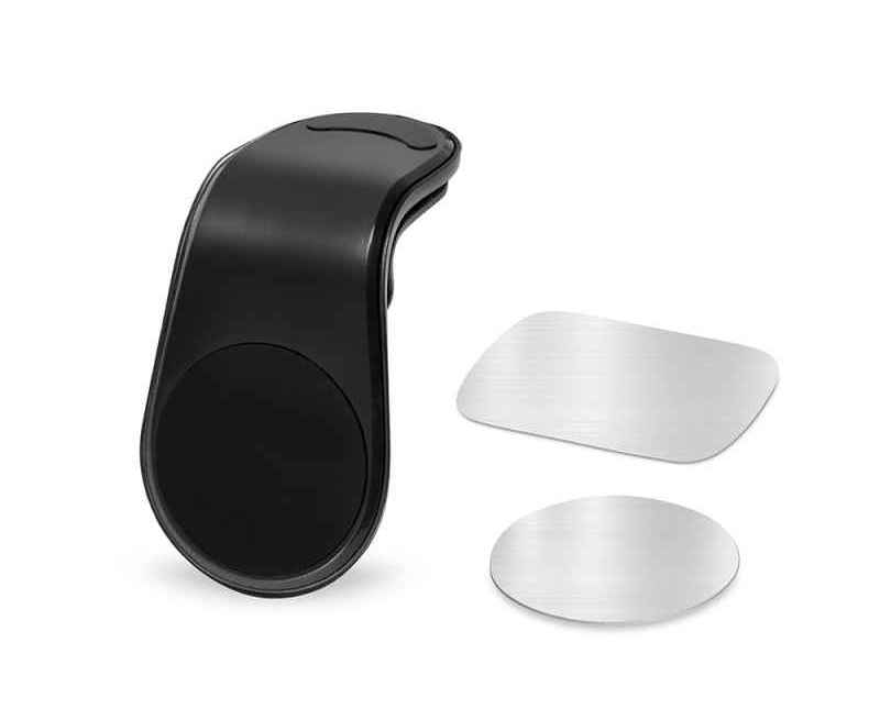 Магнитный держатель для телефона крепится к вентиляционной решетке автомобиля при помощи прищепки, которая снабжена прорезиненными вставками для плотного сцепления с поверхностью. Также в комплекте идут 2 самоклеящиеся стальные пластины. Они крепятся к смартфону.