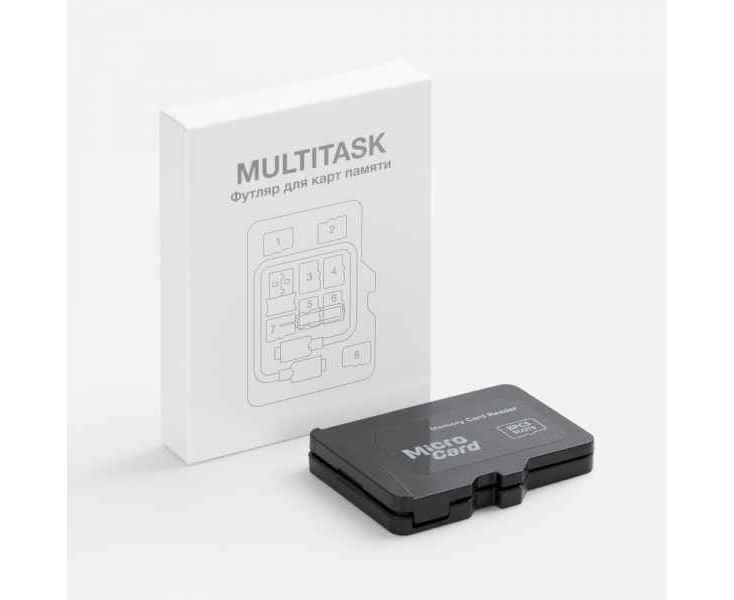 Multitask — компактный органайзер с ключом для слота SIM-карты, кабелем с разъемами USB Type-C—Type-C и переходником USB Type-A. Дизайн футляра выполнен в виде карты памяти, что делает его отличным подарком для сотрудников IT-компаний и любителей современных гаджетов.