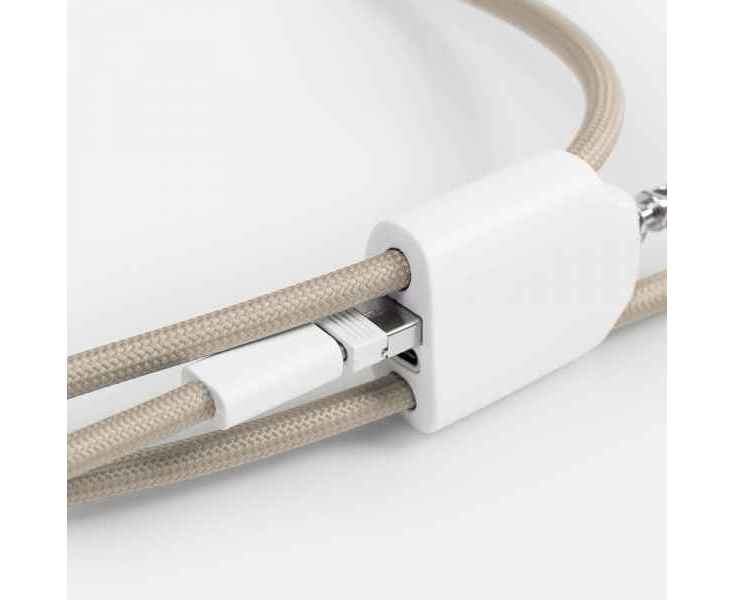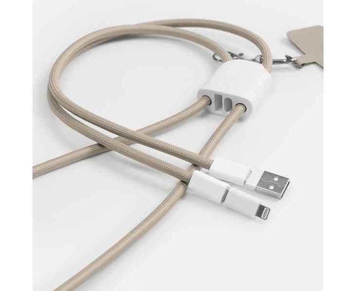 Кабель в прочной нейлоновой оплетке не заламывается и не путается, а закрепленные в гнездах держателя адаптеры с разъемами USB-A и Apple Lightning выручат в любой ситуации.
