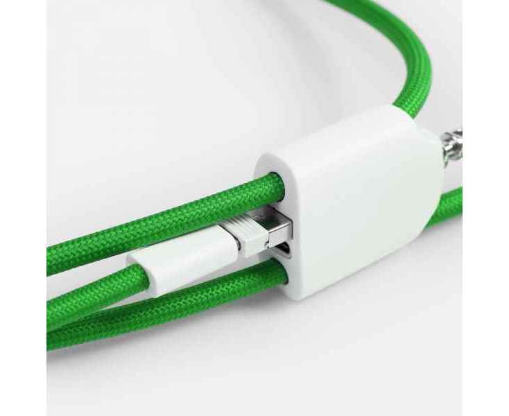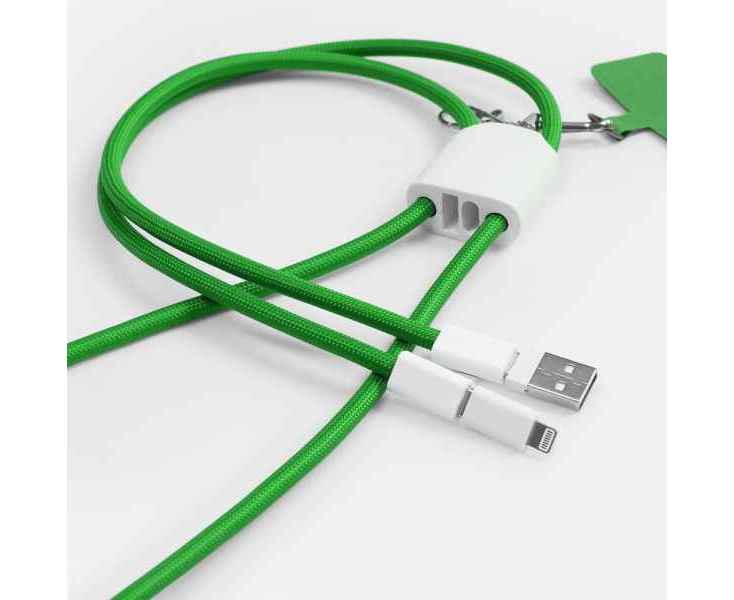 Кабель в прочной нейлоновой оплетке не заламывается и не путается, а закрепленные в гнездах держателя адаптеры с разъемами USB-A и Apple Lightning выручат в любой ситуации.