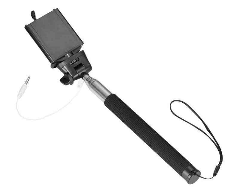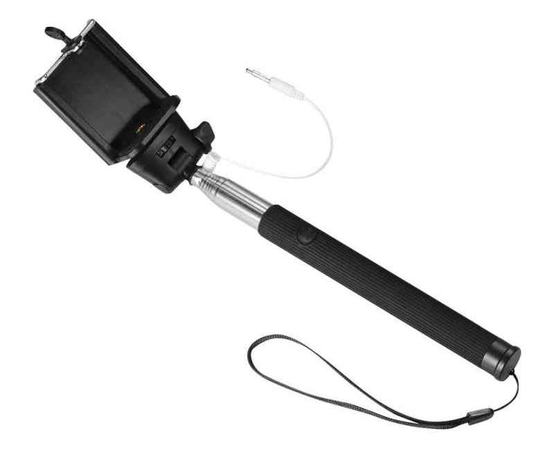 Проводной монопод. Сделайте идеальный селфи с этим выдвижным моноподом (до 90 см). Не требует батареи или использования приложения. Просто подключите 3,5 мм аудио разъем в телефон (совместим только с телефонами, у которых есть разъем 3.5 мм) и нажмите на кнопку, расположенную на ручке. Регулируемый держатель. Силикон, сталь и ПВХ.