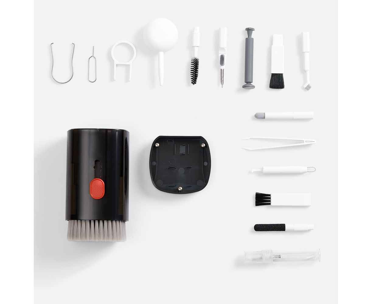 - В комплекте: большая щетка, салфетка для ухода за дисплеем, контейнер для жидкости, пластиковый пинцет, щетка с жесткой щетиной, щетка с мягкой щетиной, чистящее перо со щеткой для наушников, насадка для чистки кейса от наушников, ершик для чистки кейса от наушников, щетка с короткой щетиной, щетка с наклонной щетиной, двусторонняя насадка для чистки разъемов зарядки, двусторонняя насадка для чистки камеры, инструмент для продувки, дуговой пинцет, ключ для отсека SIM-карты, инструмент для извлечения поврежденных ключей