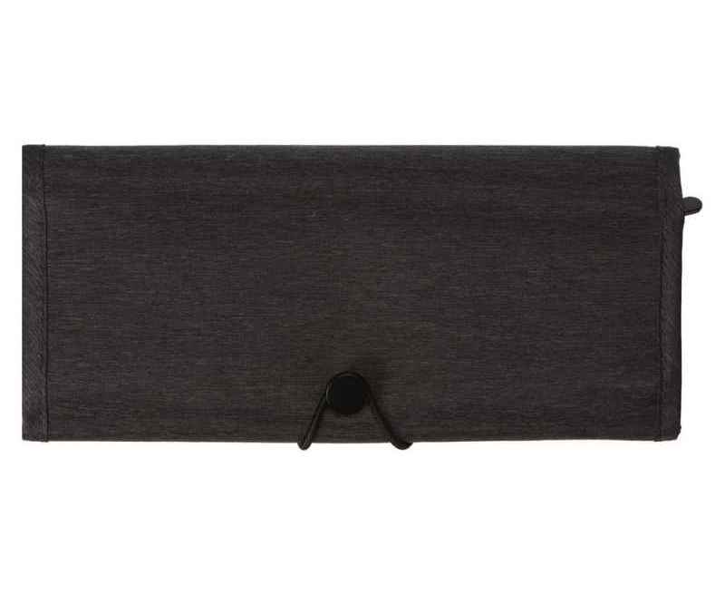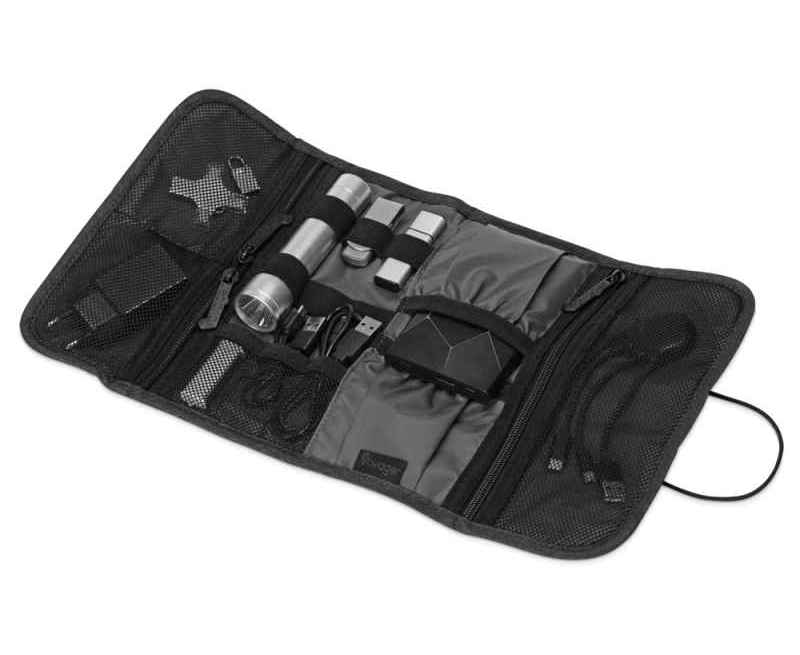 Органайзер District для электроники Voyager с множеством кармашков и отделений позволяет рассортировать девайсы, провода и другие аксессуары для техники удобным вам способом. Органайзер имеет 6 сетчатых кармашков, из них три на молнии, с бегунками, украшенными логотипом бренда. Кроме того, он имеет держатели для проводов и открытые карманы на резинке. Обложка закрывается на резинку, которая зацепляется за круглую пуговицу, и в сложенном виде органайзер весьма компактен, несмотря на свою вместительность. Благодаря форме его можно набить достаточно туго, ведь растягивающаяся резинка на обложке позволяет варьировать степень наполненности органайзера.