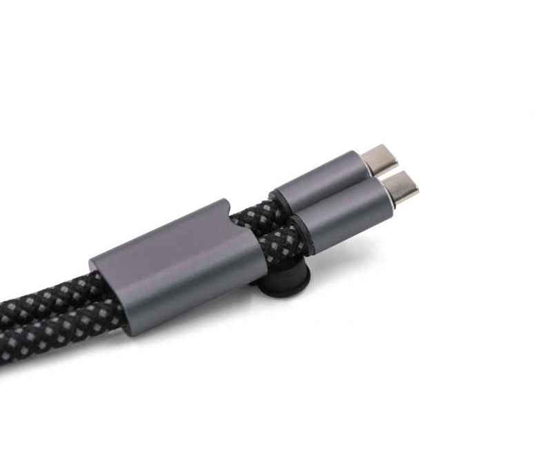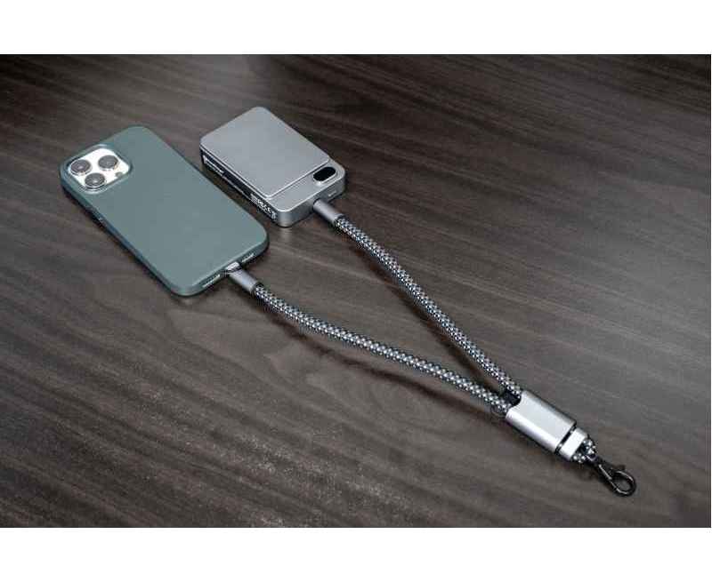 Экологичный браслет-кабель выполнен из переработанных PET-бутылок, оснащён алюминиевым корпусом и двумя разъёмами USB Type-C. Поддерживает быструю зарядку мощностью 60 Вт и передачу данных по стандарту USB 2.0. Совместим с большинством чехлов для телефонов, выдерживает нагрузку до 8 кг. Длина кабеля 28 см в собранном виде и 44 см в открытом, толщина 0,7 см. Сертифицирован по стандарту RCS (Recycled Claim Standard).