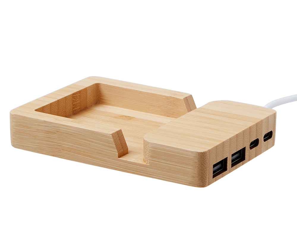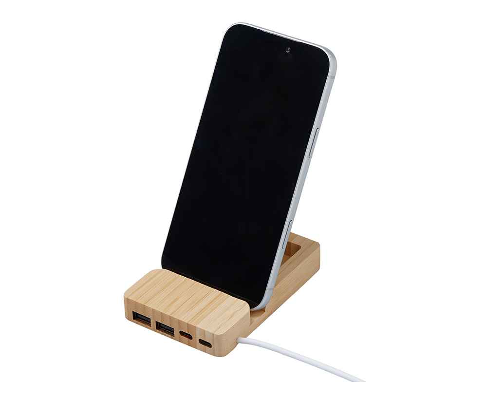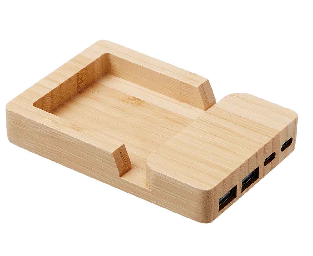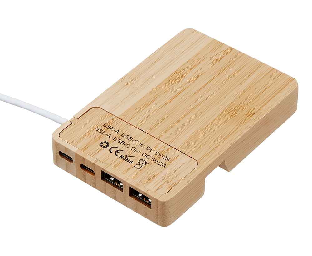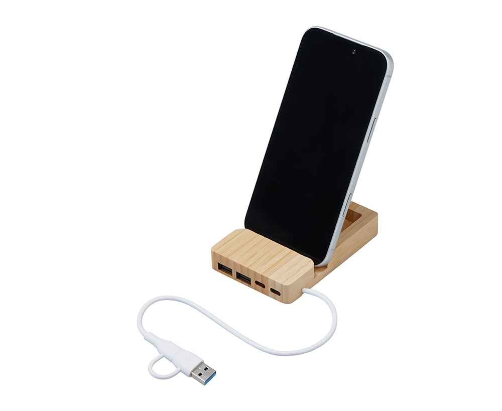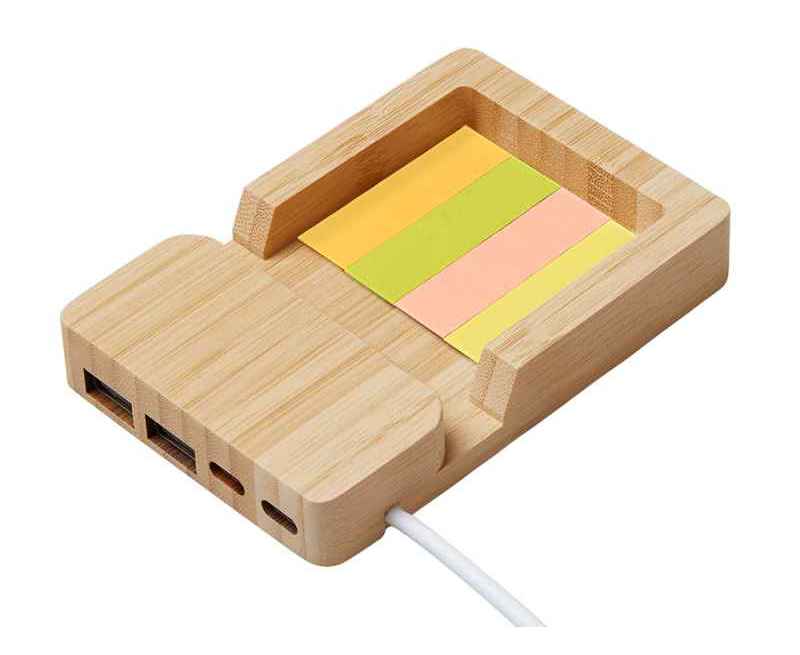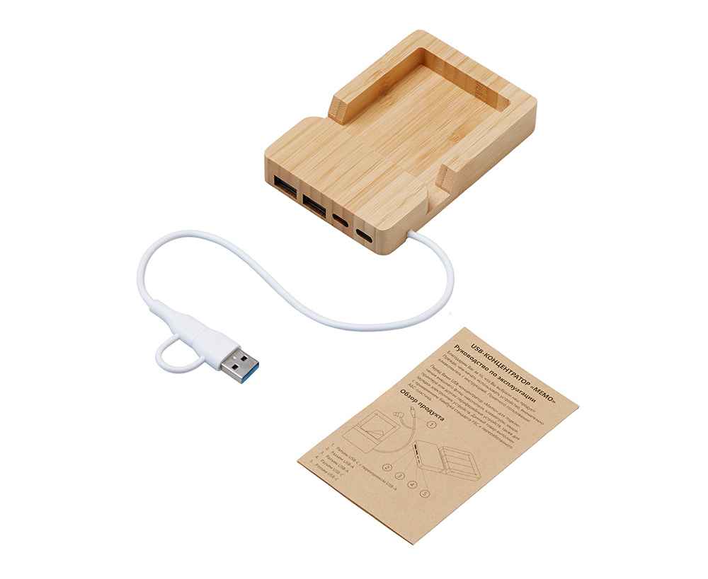 Удобный USB-хаб с экологичным дизайном и функциональностью для современного рабочего пространства. Универсальный вход USB-C/USB-A обеспечивает совместимость с любым ноутбуком, а 4 порта (2 USB-A + 2 USB-C) решают задачу подключения всех устройств в один клик. Встроенная подставка для смартфона позволяет удобно расположить гаджет под углом для просмотра видео или работы одной рукой, а скрытое отделение для стикеров и мелочей поддерживает порядок на столе. Корпус из натурального бамбука и кабели из переработанного АБС-пластика делают этот гаджет не только практичным, но и заботящимся об экологии.