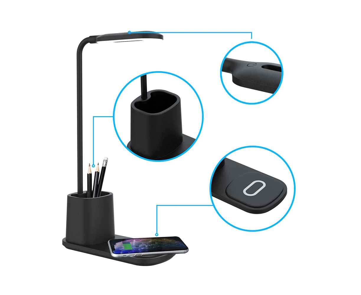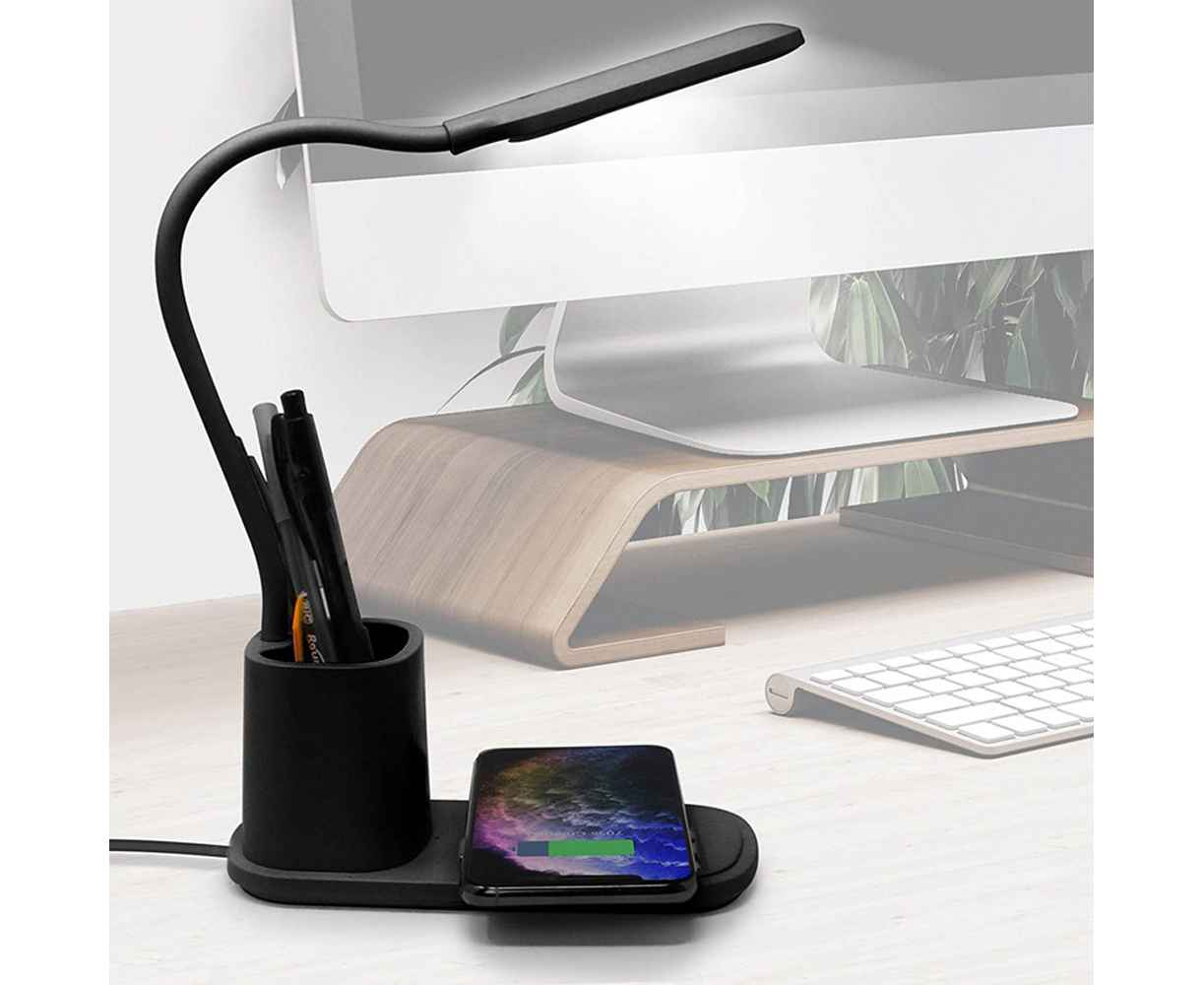 Практичная настольная лампа Tenza для использования в офисе и доме. Стильный лаконичный дизайн и гибкое поворотное регулирование лампы удобно в использовании как на офисном столе, так и прикроватной тумбе. Возможность выбирать степень яркости света несомненный плюс. Держатель для ручек дополняет функциональность. И безусловный лидер популярности – это функция беспроводной зарядки Qi. Тип лампы LED (0.5 x 20 световых диодов. Цветовая температура 3000-6000К). Беспроводная зарядка 10W. Питание: 5V/2A / 100~240V/50-60Hz. В комплекте кабель USB и инструкция. Размер в упаковке: 8,3*11*20,5 см