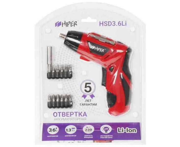 Отвертка аккумуляторная HIPER HSD3,6Li, в блистере, Li-ion батарея 1.3 Ач, 5Нм