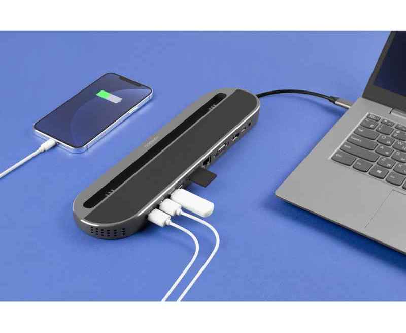 ** Для зарядки ноутбука через порт док-станции Type-C требуется использовать штатное зарядное устройство для ноутбука (в комплект устройства не входит). Ноутбук должен поддерживать зарядку через порт USB Type-C Female, к которому подключена док-станция.