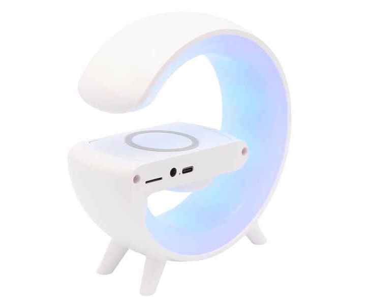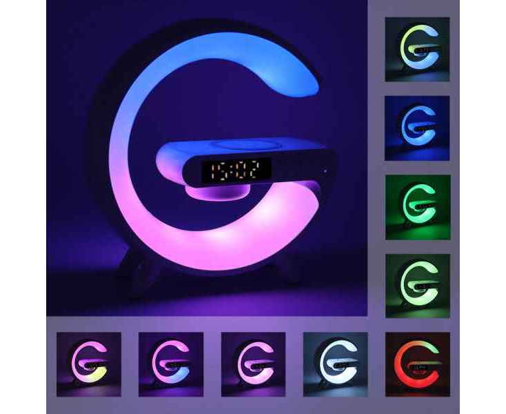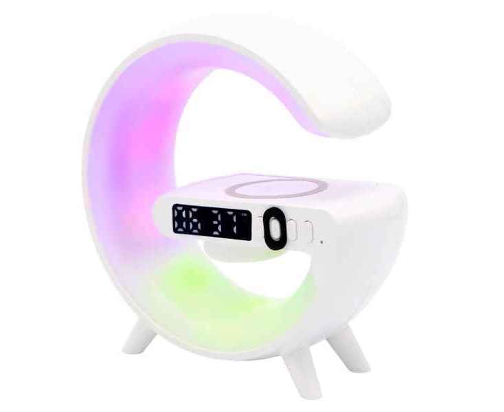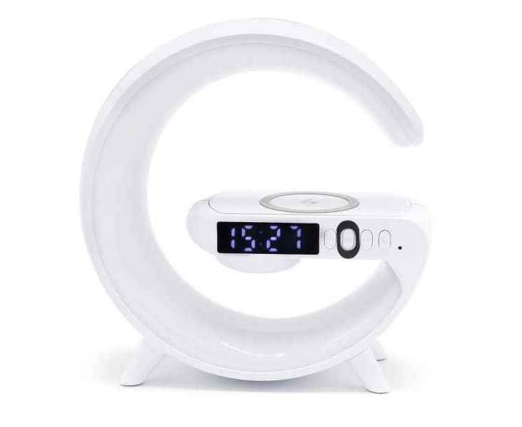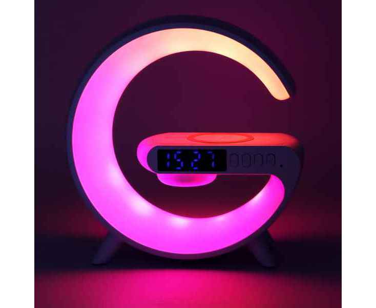 Беспроводная колонка с функцией беспроводной зарядки. Часы, будильник, RGB-подсветка, а так же защитная накладка на кнопке включения являются её особенностями. При остаточном заряде 10-20% подаётся предупреждающий сигнал. Размер: 155*55*160мм Bluetooth: v 5.2 Мощность динамика: 3W Батарея: 3.7V / 200 mAh Время работы: 2-3 Часа Время зарядки: 2,5 Часа Порт зарядки: Type-C Входное напряжение и ток: 5V/2A Беспроводное зарядное выход: 5W.