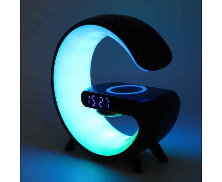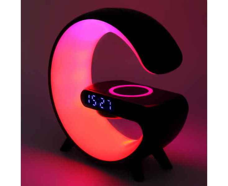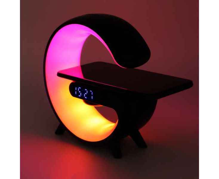 Беспроводная колонка с функцией беспроводной зарядки. Часы, будильник, RGB-подсветка, а так же защитная накладка на кнопке включения являются её особенностями. При остаточном заряде 10-20% подаётся предупреждающий сигнал. Размер: 155*55*160мм Bluetooth: v 5.2 Мощность динамика: 3W Батарея: 3.7V / 300 mAh Время работы: 2-3 Часа Время зарядки: 2,5 Часа Порт зарядки: Type-C Входное напряжение и ток: 5V/2A Беспроводное зарядное выход: 5W. Поддерживает все Android/Ios устройства с функцией беспроводной зарядки.
