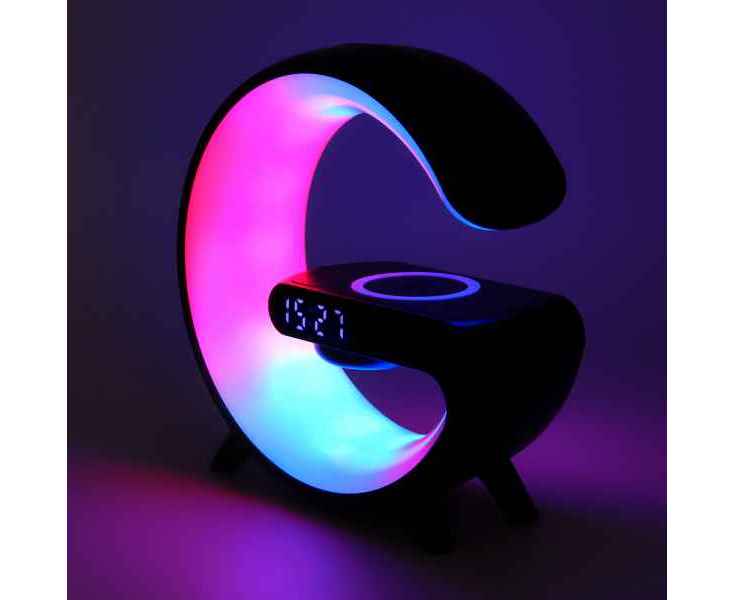 Беспроводная колонка с функцией беспроводной зарядки. Часы, будильник, RGB-подсветка, а так же защитная накладка на кнопке включения являются её особенностями. При остаточном заряде 10-20% подаётся предупреждающий сигнал. Размер: 155*55*160мм Bluetooth: v 5.2 Мощность динамика: 3W Батарея: 3.7V / 300 mAh Время работы: 2-3 Часа Время зарядки: 2,5 Часа Порт зарядки: Type-C Входное напряжение и ток: 5V/2A Беспроводное зарядное выход: 5W.