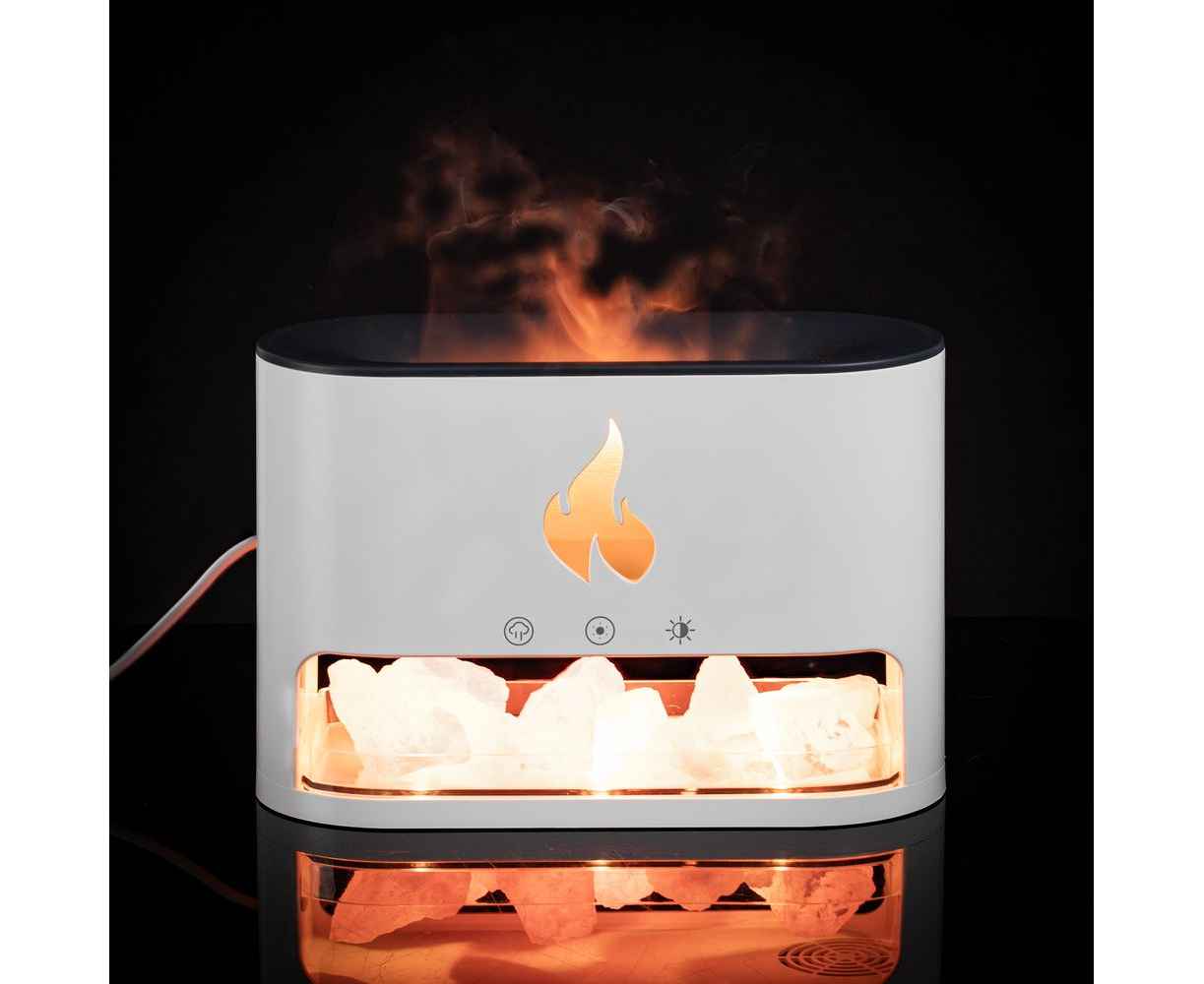 Благодаря оптическому эффекту пламя как будто вырывается из устройства, напоминающего настольный камин, а соль становится похожа на угли от прогоревших дров.