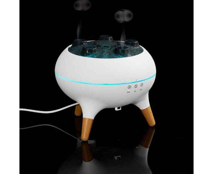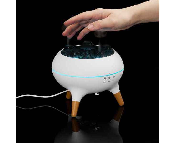 Помимо стандартных струек пара посередине крышки, Cloudini умеет выпускать маленькие облачка влажного воздуха из 5 отверстий по окружности поочередно или динамически — в такт музыке. Устройство реагирует на звуковые колебания и выстраивает интенсивность распыления в зависимости от мелодии.