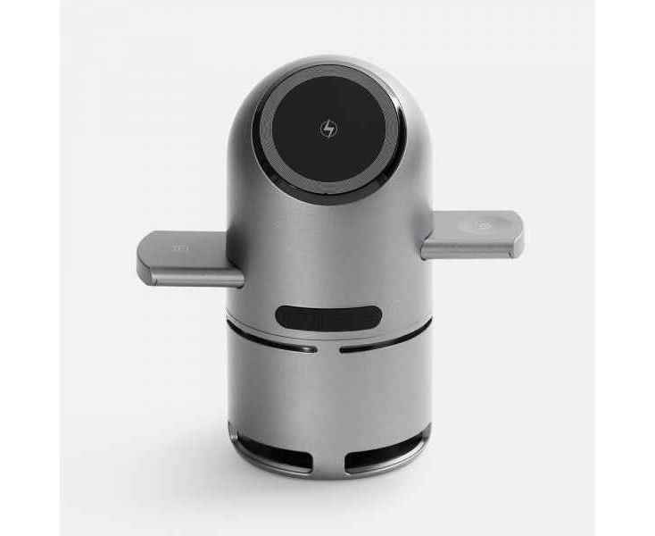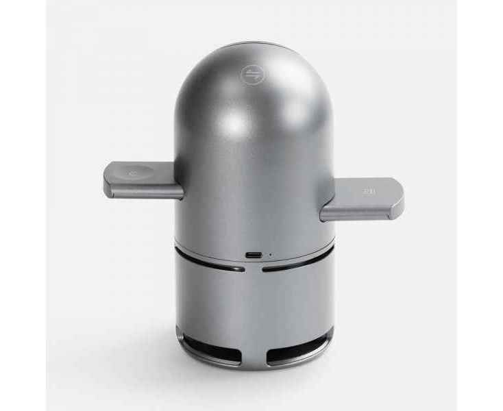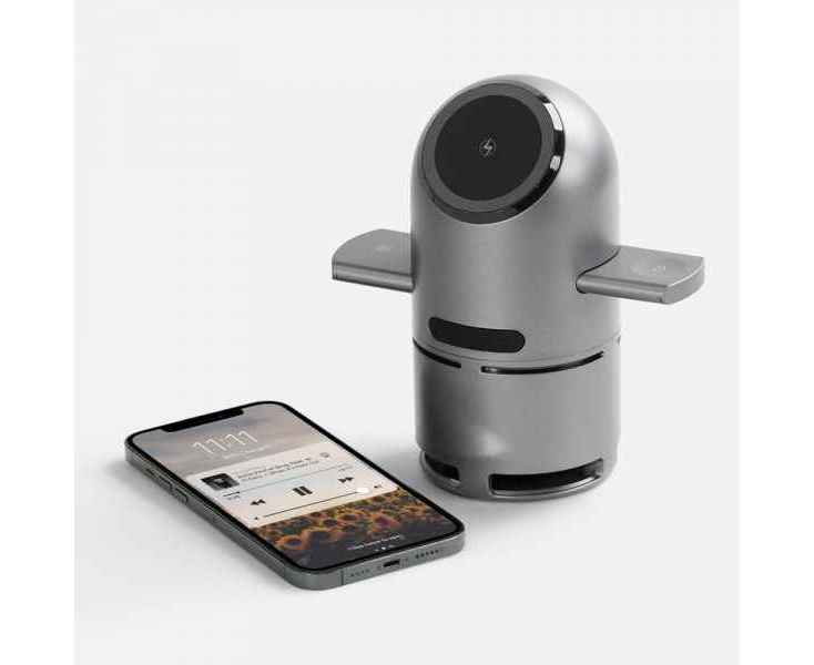Droid — это технологичная Bluetooth-колонка с подвижными площадками для беспроводной зарядки смартфона, наушников и часов. Droid подразумевает активное тактильное взаимодействие с пользователем: если колонку погладить, появятся или исчезнут индукционные площадки для зарядки умных часов и наушников. Зарядная площадка для смартфона вращается на 90°: во время зарядки легко поменять ориентацию экрана с вертикальной на горизонтальную.
